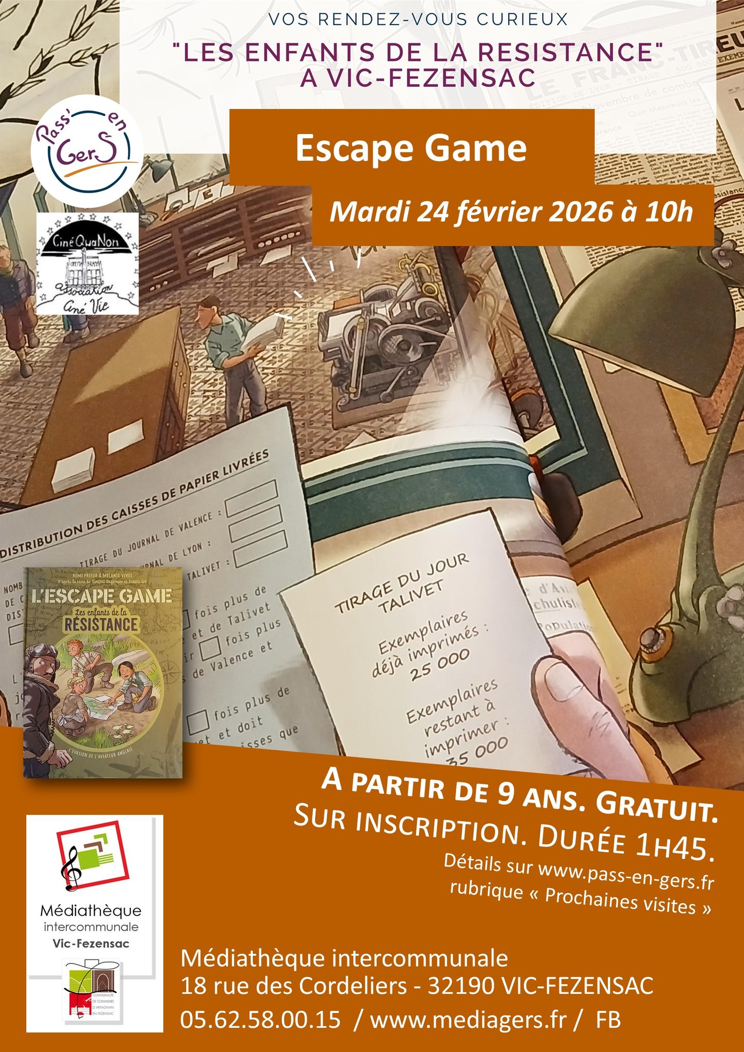 Marie-Sabrina Bonnaffé, guide-conférencière de Pass’enGers, animera un escapegame tiré de la BD « Les enfants de la Résistance ». Les enfants seront répartis en plusieurs groupes et résoudront l’un des défis suivants :