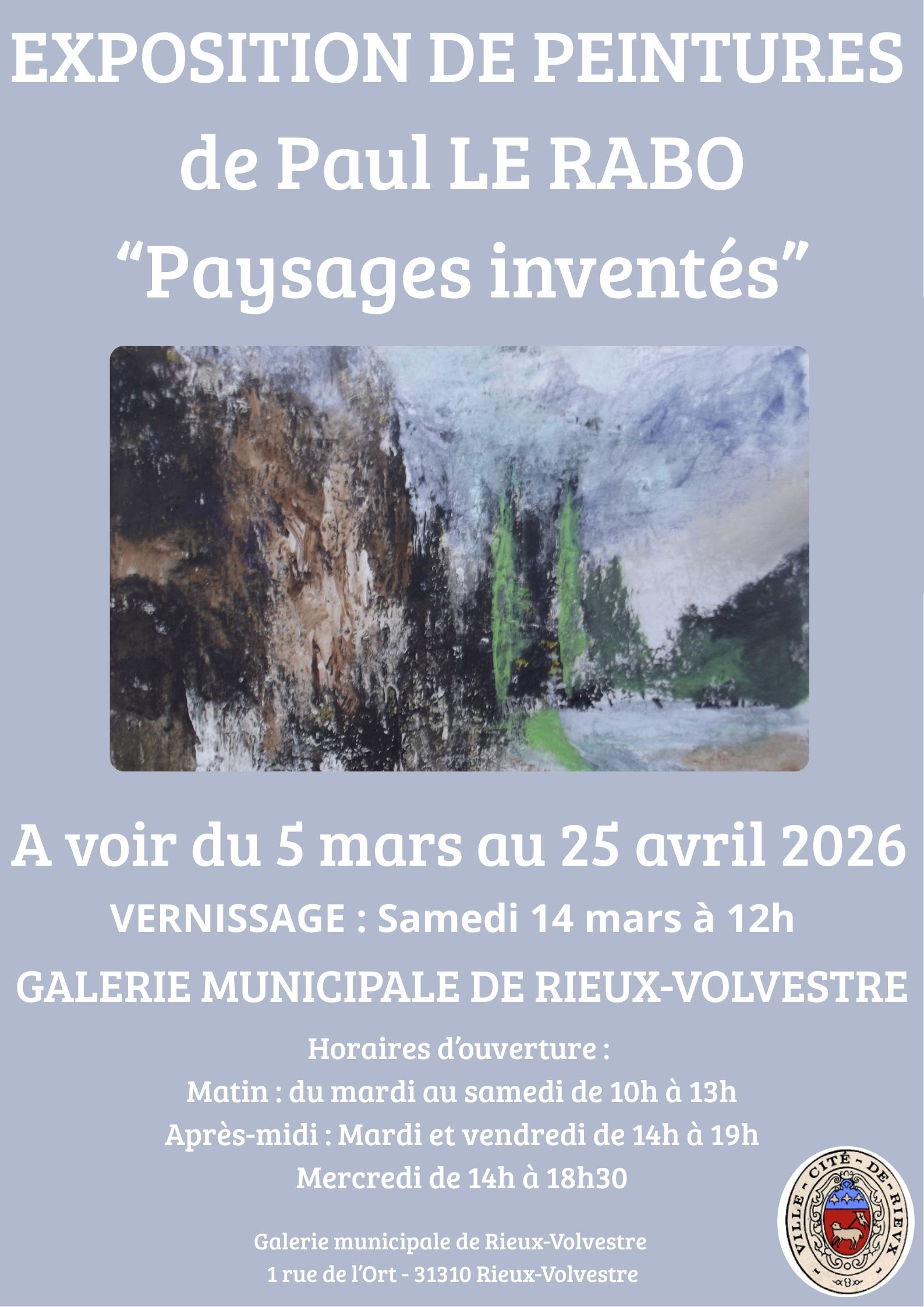 Programme : Présentation de l’exposition par l’artiste : « A travers l’évocation d’un paysage inventé, je tente de traduire son esthétique et sa poésie. Paysages revisités, imaginés sont au cœur de ma narration picturale. Les effets de couleurs et de matières visent à retranscrire dans le domaine de la perception visuelle, la contemplation de la nature, inlassablement réinterprétée et recréée. Se situant à la limite entre le figuratif et l’abstrait, ma peinture donne à voir le champ du visible et de l’invisible, du réel et de l’imaginaire. » N’hésitez à venir visiter cette exposition et voyager à travers ces paysages imaginaires et poétiques. Le vernissage aura lieu : samedi 14 mars à 12h. Venez rencontrer Paul Le Rabo et découvrir son travail et son univers. Cette exposition est à voir du 5 mars au 25 avril : mardi et vendredi de 10h à 13h et 14h à 19h ; mercredi de 10h à 13h et de 14h à 18h30 ; jeudi de 10h à 13h ; samedi de 10h à 13h. Accès soit par l’entrée de la bibliothèque municipale ; soit par l’office de tourisme intercommunal du Volvestre. Galerie municipale de Rieux-Volvestre – 1 rue de l’Ort – 31310 Rieux-Volvestre – 05.61.98.42.00 – bibliotheque@mairie-rieux-volvestre.fr