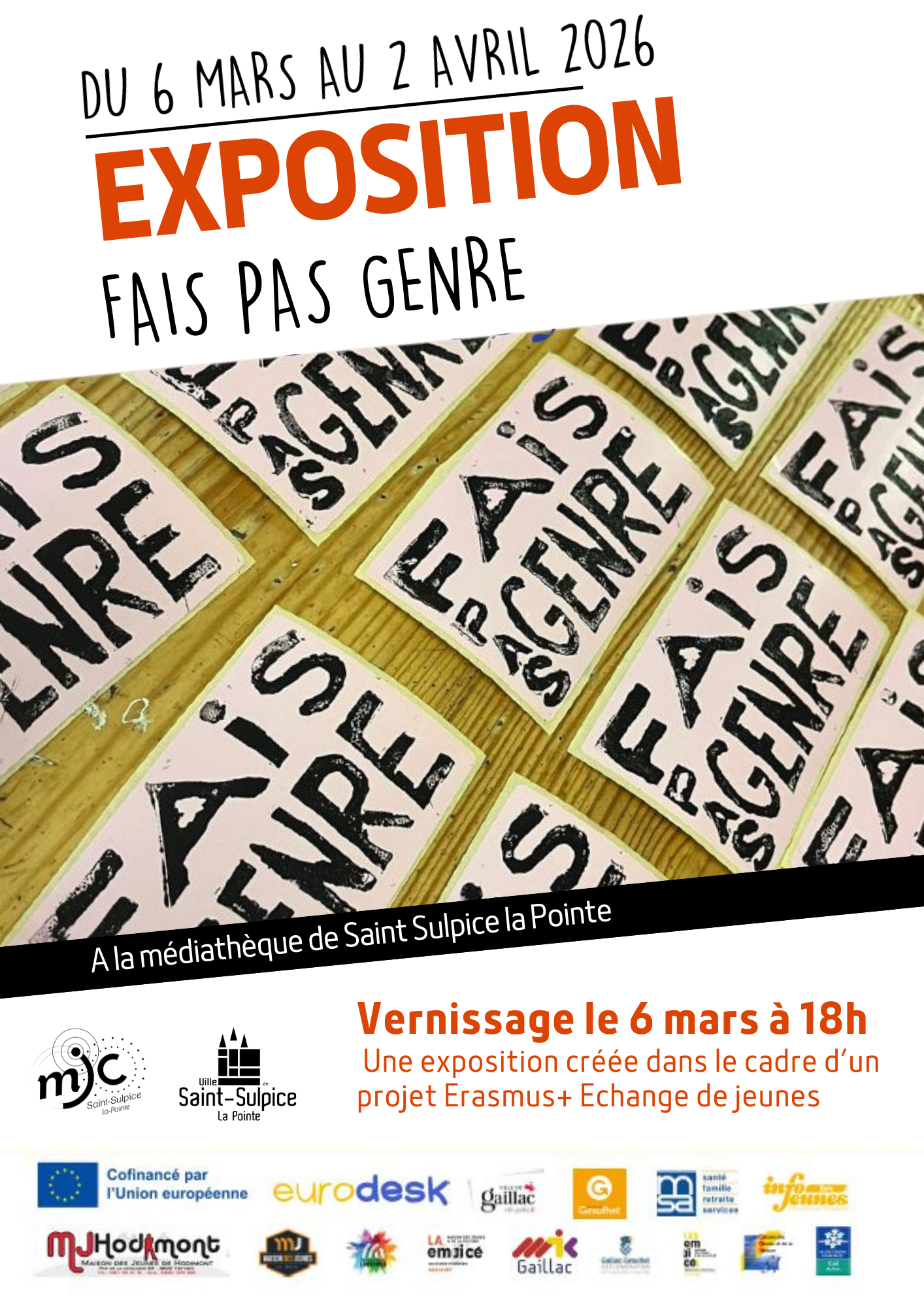 La MJC et la Médiathèque de Saint Sulpice s’associent pour vous proposer une exposition thématique créée par des jeunes dans le cadre d’un projet Erasmus+. Venez découvrir leurs créations sur le thème de l’égalité de genre tout au long du mois de mars.