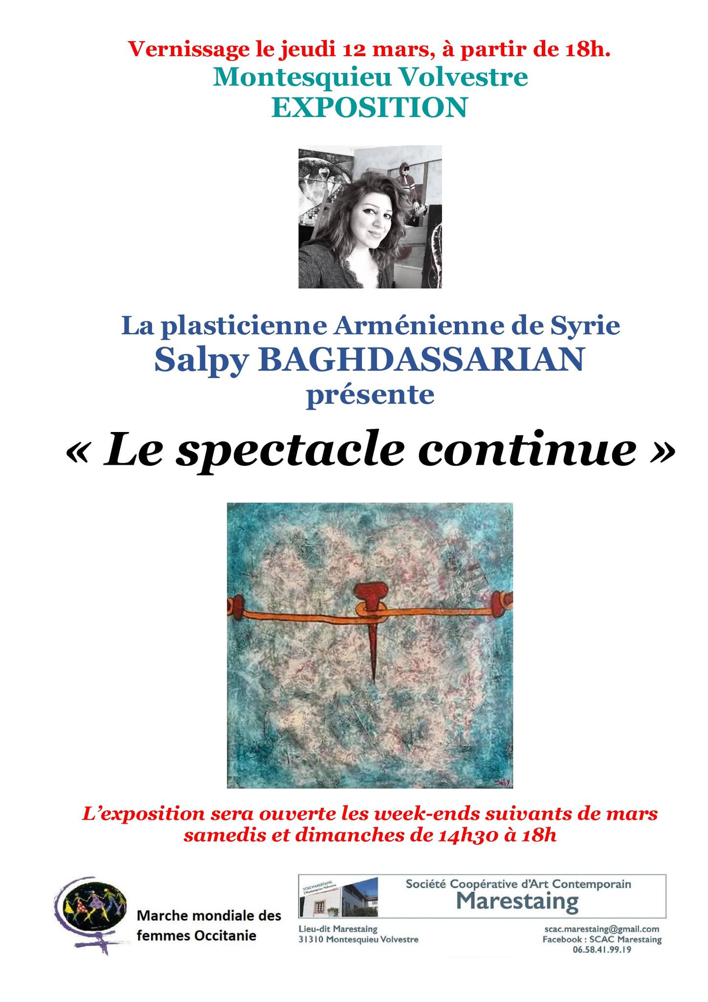 Programme : Rendez-vous le jeudi 12 mars à partir de 18h à la Scac Marestaing à Montesquieu-Volvestre. Le printemps est de retour, il est temps de nous retrouver à Marestaing pour le premier vernissage de l’année ! Le vernissage de l’exposition “ Le spectacle continue “ est prévu le jeudi 12 mars à partir de 18h Pour celles et ceux qui ne pourront venir au vernissage nous vous accueillerons pendant les week-ends suivants du mois de mars, entre 14h et 18h30. Salpy Baghdassarian, réfugiée, Arménienne de Syrie, nous présente une œuvre de 13 mètres sur 2 mètres. Plasticienne et poétesse, elle dira ses poèmes lors du vernissage. Arrivée de Syrie, elle a appris le français et repris ses études et cette année elle commence son doctorat en art contemporain à l’université Jean Jaurès de Toulouse, après avoir obtenu une note de 20/20 pour l’œuvre qu’elle nous présente. Elle s’engage aujourd’hui dans des actions collectives pour soutenir les autres.