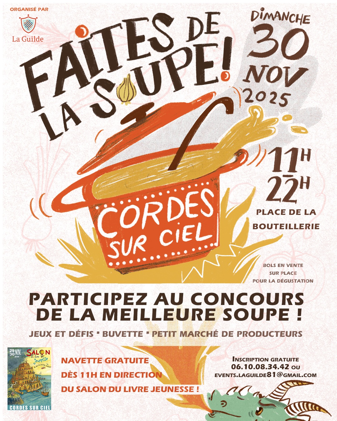 Faites de la soupe à Cordes sur Ciel ! Dim. 30 nov. dès 11h, place de la Bouteillerie : concours, dégustations, marché de producteurs, jeux et buvette. Navette gratuite vers le Salon du Livre Jeunesse.