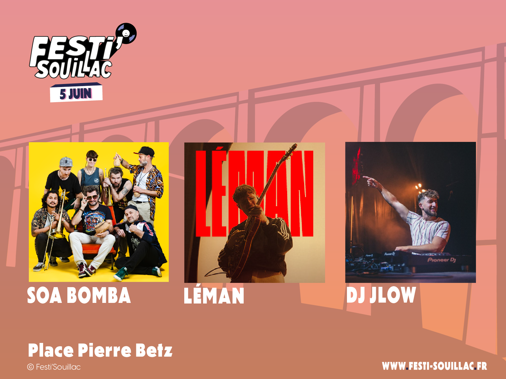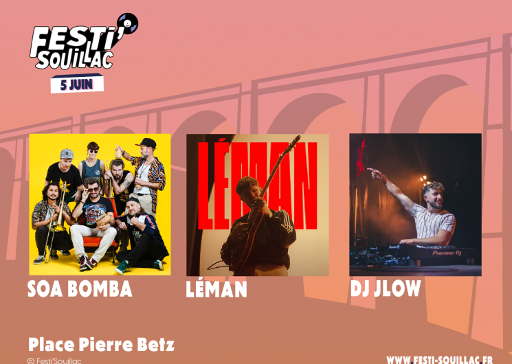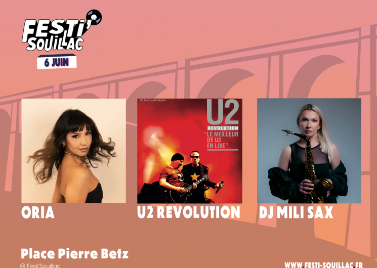 L'association Bodega Souillac, a le plaisir de vous annoncer la seconde édition du Festival Festi'SouillacCe festival, qui se déroulera les 5 et 6 juin 2026, est le fruit d'une synergie qui prouve que « l'union fait la force » et que, ensemble, nous allons plus haut, plus loinUn Festival éclectique au cœur de SouillacLe festival se tiendra sur la place Betz, au pied de l'abbaye célèbre pour ses trois coupoles. Un site exceptionnel et unique pour un festival haut en couleurs.Deux soirées exceptionnelles sont prévues, avec trois concerts variés, allant du rock à l'électro, sans oublier des musiques latinesCe choix de programmation éclectique vise à plaire à tous les âges, faisant de cet événement une véritable fête intergénérationnelle où chacun vit des moments de partage et de convivialité en famille
