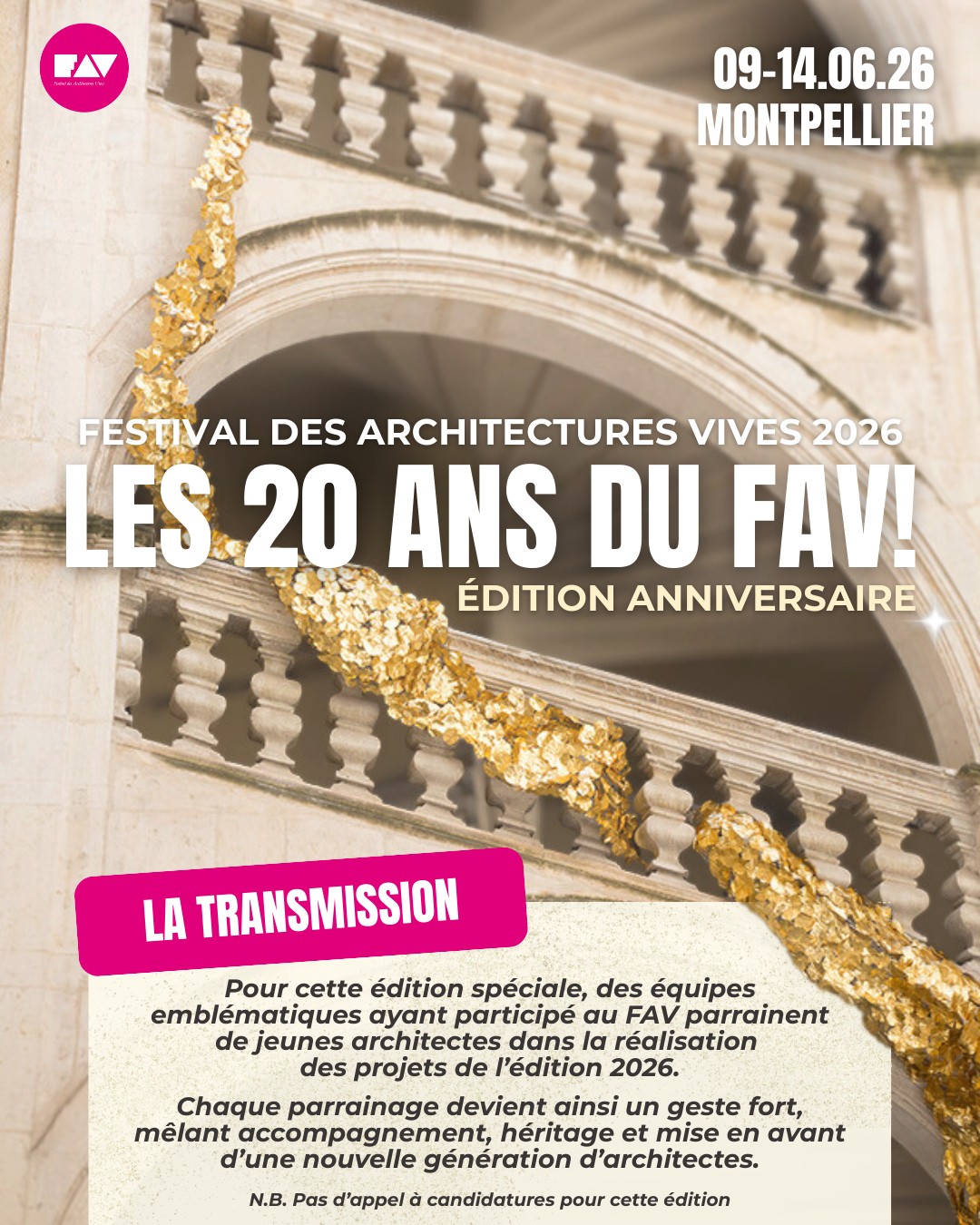 La 20ème édition du Festival des Architectures Vives se déroule du 09 au 14 juin 2026 à Montpellier ! Le festival aura pour thématique LA TRANSMISSION.