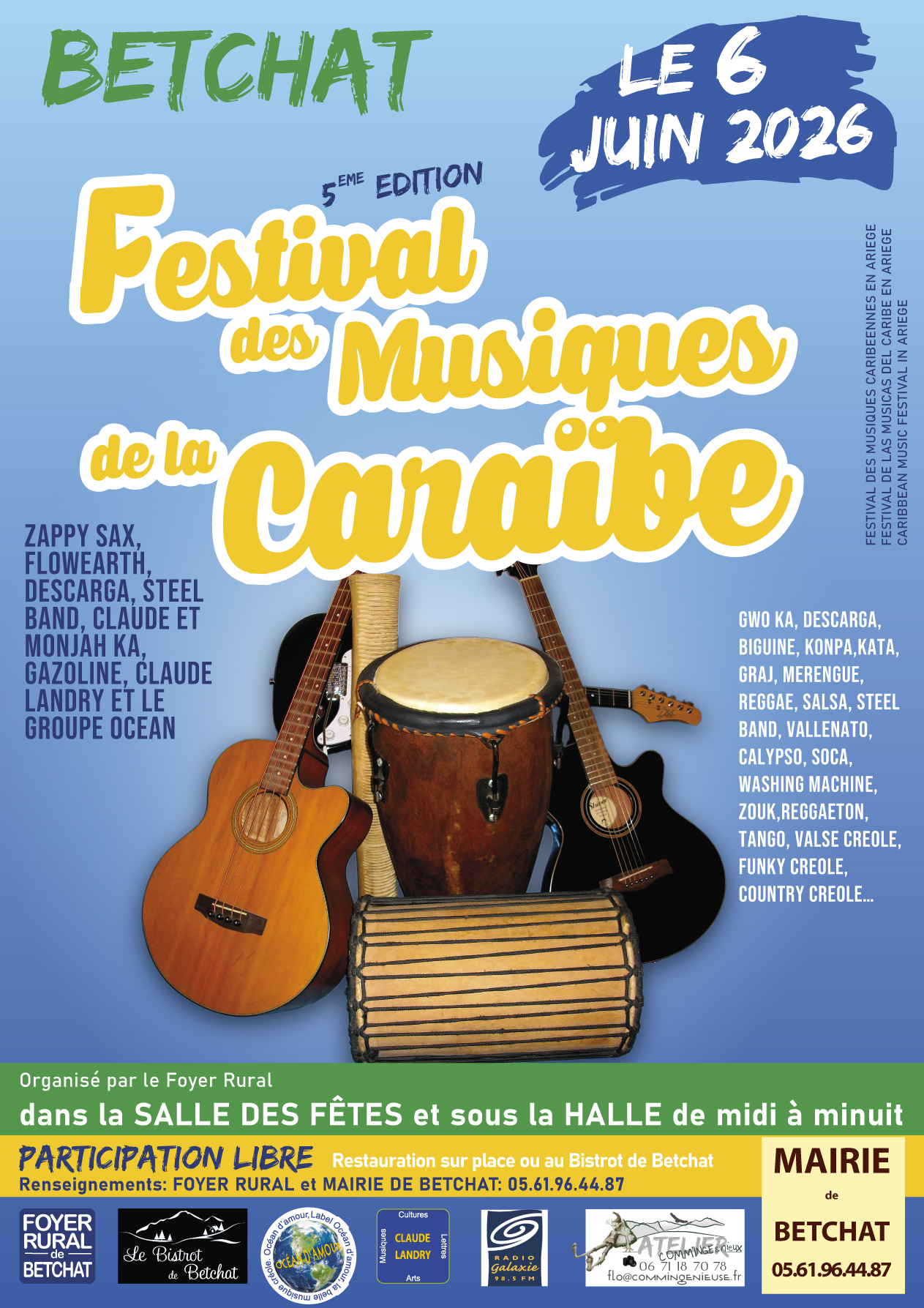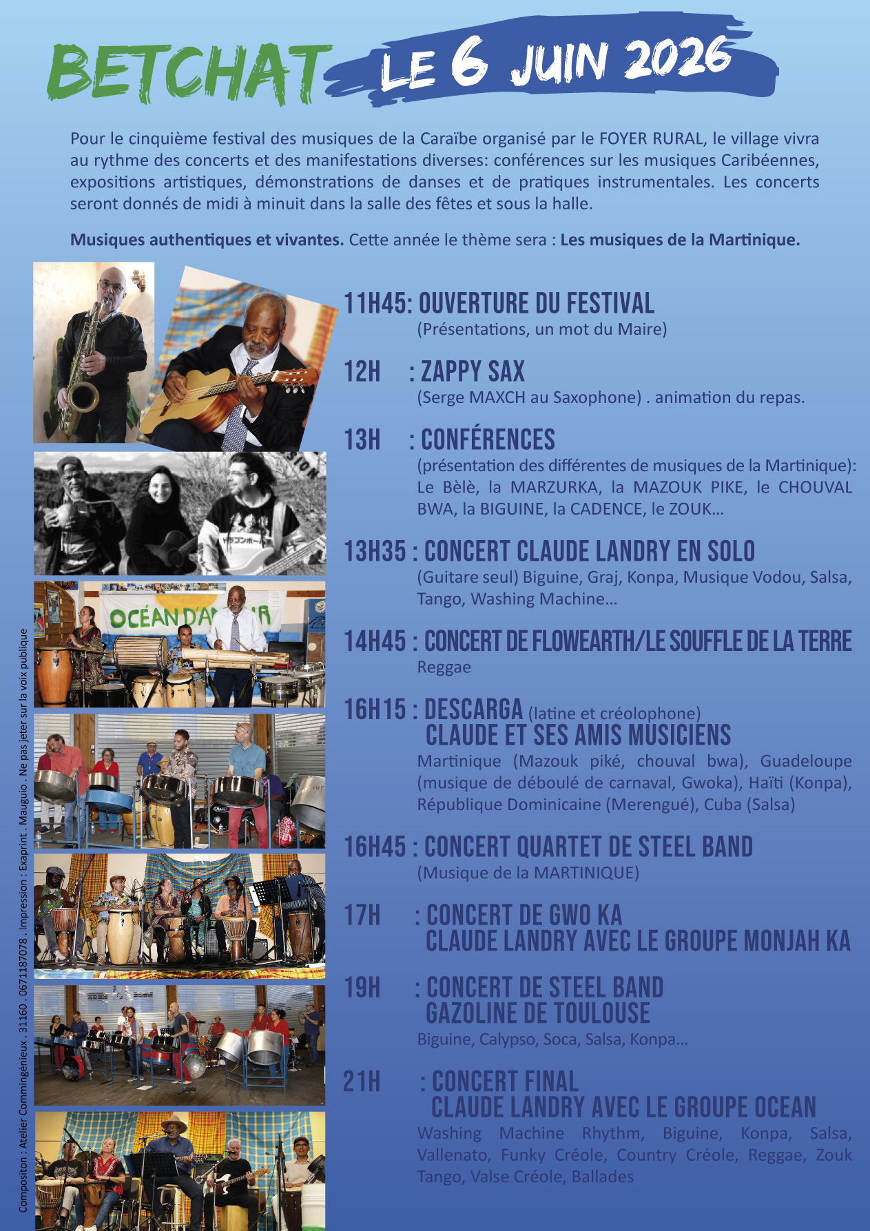Pour sa 5 éme édition, le Festival des musiques de la Caraïbe organisé par le FOYER RURAL fera vivre Betchat au rythme des musiques Caribéennes le Samedi 6 Juin 2026 !