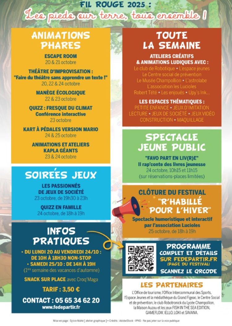 Programme : Du lundi au samedi de 10h à 18h30 plus deux nocturnes – 20 & 21 octobre : Escape Room – 20, 22 & 24 octobre : Théâtre d’improvisation « Faire du théâtre sans apprendre un texte ! » – 22 & 23 octobre : Manège écologique – 23 octobre : Quizz Fresque du climat (conférence interactive) – 23 & 24 octobre : Ateliers Kapla géants – 24 & 25 octobre : Kart à pédales version Mario – Toute la semaine : Ateliers ludiques avec divers partenaires locaux (robotique, prévention, astronomie, etc.) – 23 octobre, 19h30 à 23h : Soirée jeux de société – 24 octobre, 18h à 19h : Quizz en famille – 24 octobre, 10h15 & 11h15 : Spectacle jeune public « Favo part en liv(r)e » – 25 octobre, 18h à 19h : Clôture avec un spectacle « R’habillé pour l’hiver »