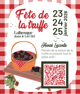 Programme : Samedi 24 janvier : – 10h : Balade dans les truffières Suivez Les Chemins de Colins pour une balade de 2,5 km à la découverte des secrets de la truffe du Quercy. De la botanique aux légendes locales, laissez-vous conter l’histoire du diamant noir. 10h : Départ de la balade de 2,5km – Durée 1h30 à 2h – devant la maison de la truffe (rue du marché aux truffes). Animée par les Chemins de Colins. Gratuit, sur inscription. – 19h30 : Repas découverte de la truffe Nous vous proposons un repas découverte à 45 € vin et café compris, animé par la chanteuse Sabrina pour une soirée festive et chaleureuse. Au menu : velouté de topinambour et crème fouettée truffée, suivi d’un médaillon de pintade, farce fine à la truffe, sauce suprême truffée et purée grand-mère truffée. Puis place au brie truffé et mesclun, avant de terminer en douceur avec une brioche perdue, glace vanille truffée et caramel beurre salé truffé. Grâce au fidèle traiteur de la fête de la truffe « Saveurs et émotions » vous vivrez une expérience gourmande qui célèbre la truffe comme il se doit ! Sur réservation, places limitées. Dimanche 25 janvier : – 11h15 : Brunch gastronomique par le chef étoilé Pascal Bardet – Le Gindreau Le chef Pascal Bardet (Le Gindreau) sublime le Diamant Noir ! Découvrez un menu gastronomique audacieux : Croq’aux truffes, Consommé de canard au noir de truffe, élégante Batavia Rossini, riche Bouchée à la reine au ris de veau, puis le surprenant Coulommiers truffé et l’inoubliable dessert « Île flottante… truffée » au caramel truffé. Une expérience culinaire unique, de l’entrée au dessert, tout en truffe ! Au menu : • Cocktail maison, champi/truffe comme un condiment, truffe en croûte, croq’aux truffes et comté. • Consommé de canard, noir de truffe, miettes aux sucs, mique poêlée, truffe pure. • Batavia Rossini, truffe râpée sur l’instant salade d’hiver braisée et foie gras. • Bouchée à la reine riche en truffe champignons de cave, noix de veau, graton de ris au jus truffé. • Du bout des doigts, coulommiers, truffe noire. Pain doré. • « Souvenirs » …. Ile flottante …. Mais truffée, brioche dorée, caramel truffé. Sur réservation, places limitées. – 12h00 : Brouillade aux truffes avec le Site Remarquable du Goût Savourez une brouillade aux truffes avec les cheffe et chefs du Site Remarquable du Goût. Sous chapiteau, au cœur de la Fête de la Truffe, près de l’église, un moment gourmand à ne pas manquer ! Sur réservation, places limitées. – 12h30 : Repas gastronomique à la truffe Une belle occasion de savourer un menu généreux et entièrement dédié à la truffe. Ce repas commencera par un œuf parfait, mousseline de pommes de terre truffée, sauce meurette et noisettes grillées, suivi d’un effeuillé de bœuf, sauce foie gras et truffe, risotto aux éclats de truffe et légumes d’hiver. Vous poursuivrez avec un crumble salé au Rocamadour et mascarpone truffé, avant de terminer sur un dôme de nougat glacé, crème anglaise et chantilly truffée. Grâce au fidèle traiteur de la fête de la truffe « Saveurs et émotions » vous participerez à un déjeuner savoureux et convivial, idéal pour célébrer la truffe en toute simplicité. Sur réservation, places limitées. – 16h00 : Démonstration culinaire : un goûter truffé ! Découvrez les secrets de la préparation choux truffés d’Anne-Lise Déport, pâtissière à Lalbenque, qui sublime ce produit d’exception. Une création gourmande qui révèle toute la finesse et l’arôme unique de la truffe noire. Gratuit, sur inscription.