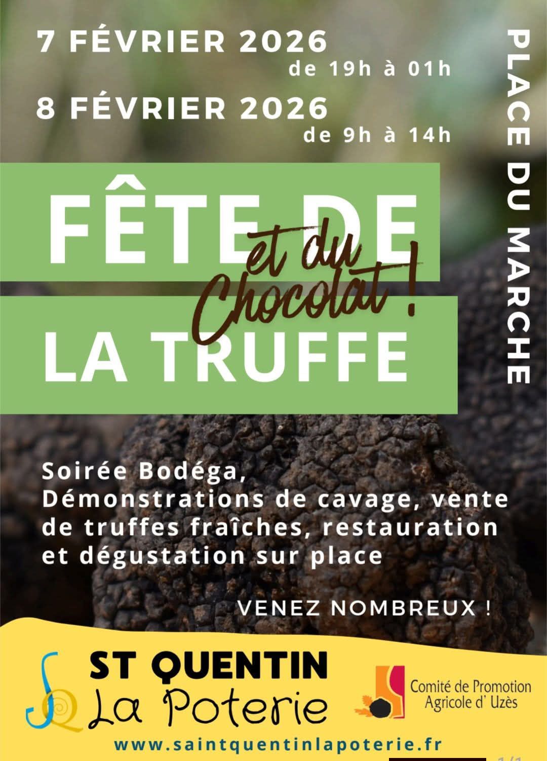 Pour la saison de la truffe, la Mairie de St-Quentin-la-Poterie vous propose, un marché à la truffe (vente par les producteurs). Stands de produits truffés, vente directe et différentes animations. De la nouveauté cette année avec un salon du chocolat !