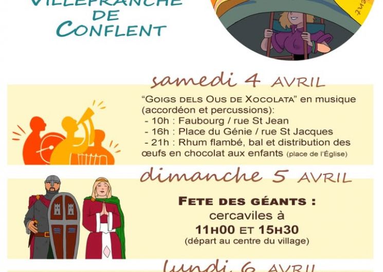 Animations de Pâques à Villefranche-de-Conflent du 4 au 6 avril. Musiques de rue, bal et distribution d’œufs en chocolat le samedi. Fête des géants et cercaviles le dimanche. Aplec de Notre-Dame de Vie le lundi avec messe et chorales. Activités gratuites ouvertes à tous.