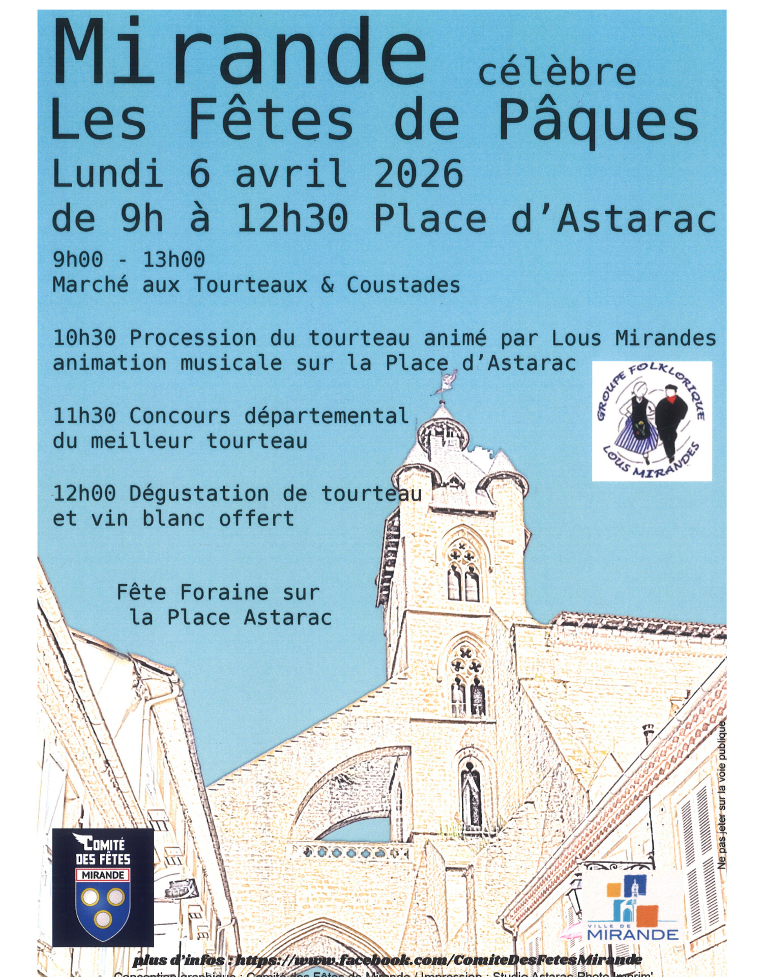 Lundi, sur la place d’Astarac, marché aux tourteaux et croustades. À 10h30 procession du tourteau animée par Lous Mirandès, à 11h30 concours départemental du meilleur tourteau, à 12h dégustation et vin blanc offert.