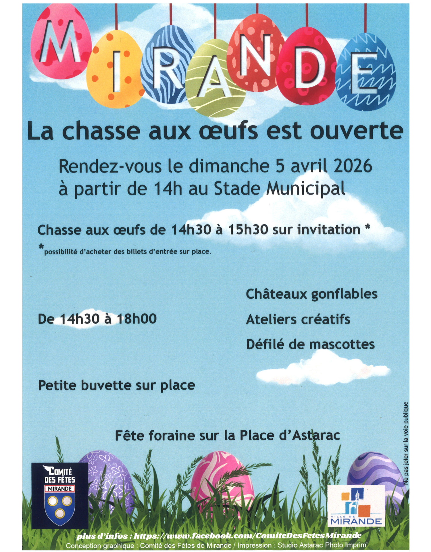 Les festivités à Mirande commenceront dimanche avec la chasse aux œufs et animations au stade municipal (payant). Au programme de cette journée jusqu’à 18h : la chasse aux œufs de 14h30 à 15h30, ateliers créatifs, défile de mascottes, château gonflable… Petite buvette sur place. Possibilité d’acheter les billets sur place.