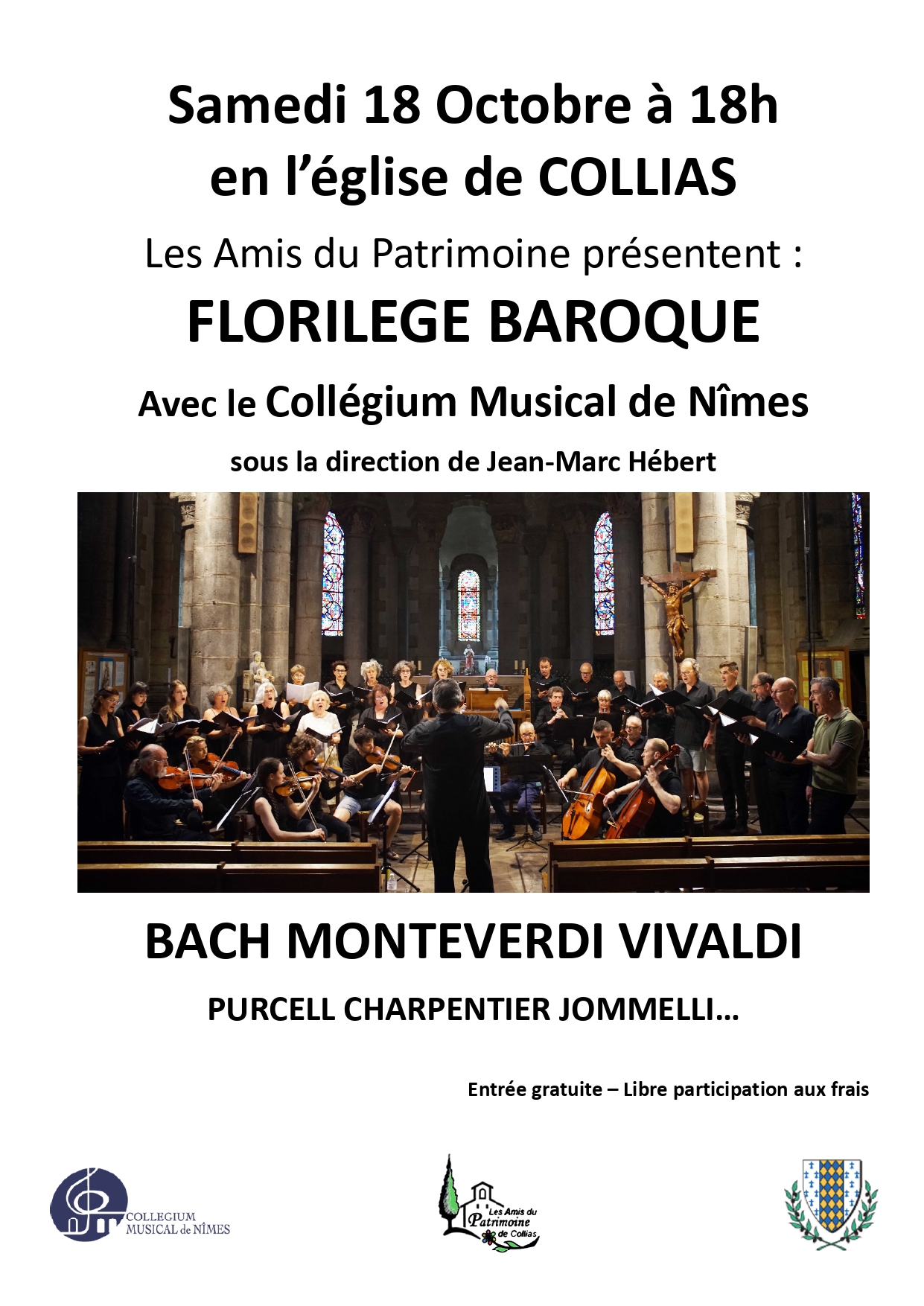 Florilège Baroque est un programme choisi d’extraits ou œuvres maîtresses de Bach, Vivaldi, Monteverdi, Charpentier, Purcell… par le Collégium Musical de Nîmes, 20 chanteurs et 12 instrumentistes dirigés par Jean-Marc Hébert.