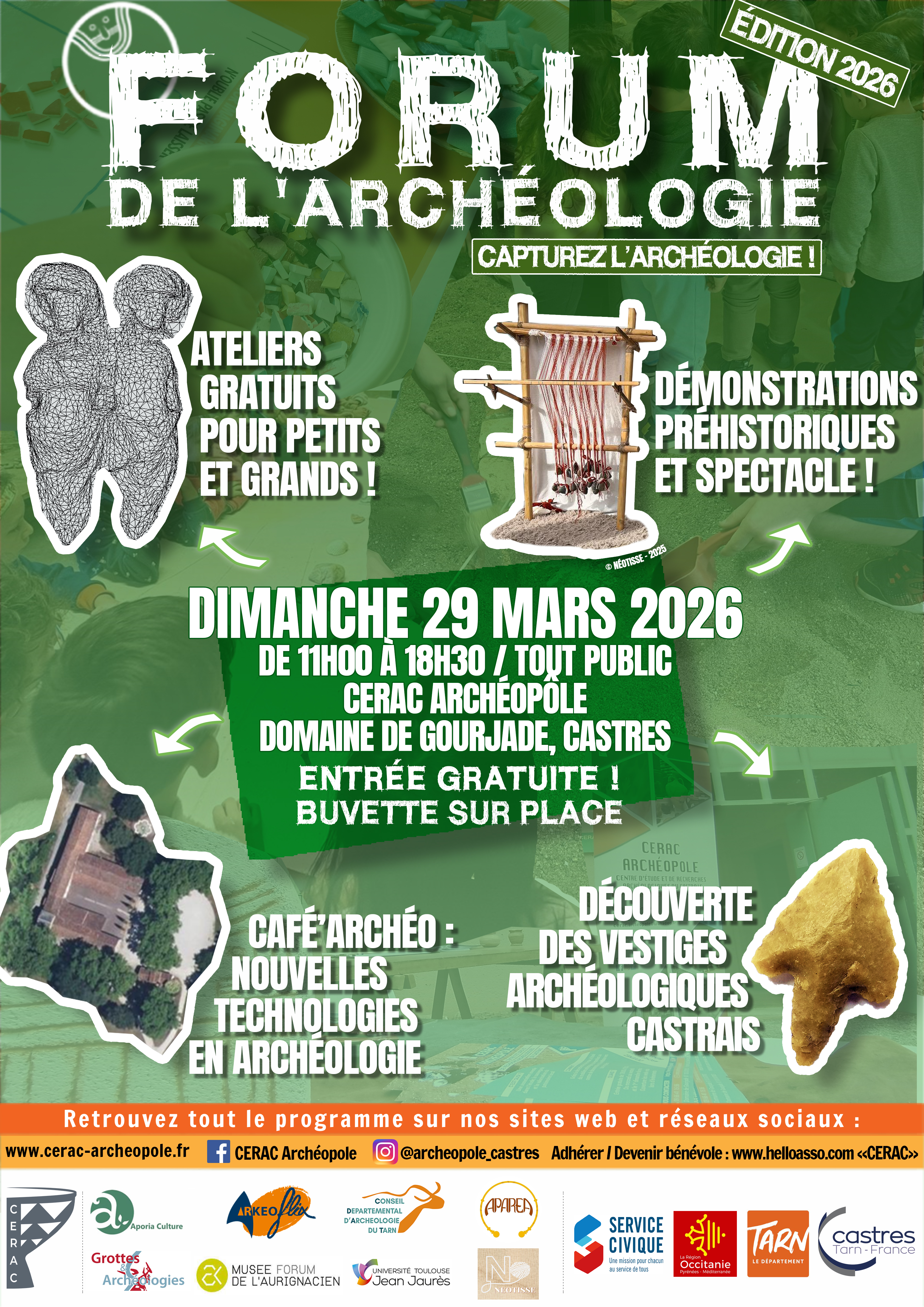 Et comme toujours, venez rencontrer les acteurs de l’archéologie régionale : Grottes & Archéologies, Aporia Culture, Comité départemental d’Archéologie du Tarn, Musée forum de l’Aurignacien, APAREA, Néotisse et bien d’autres !