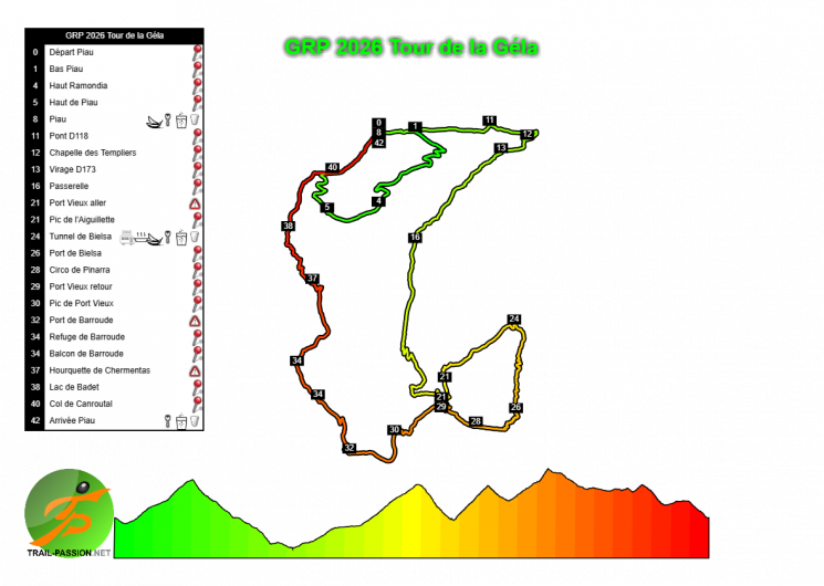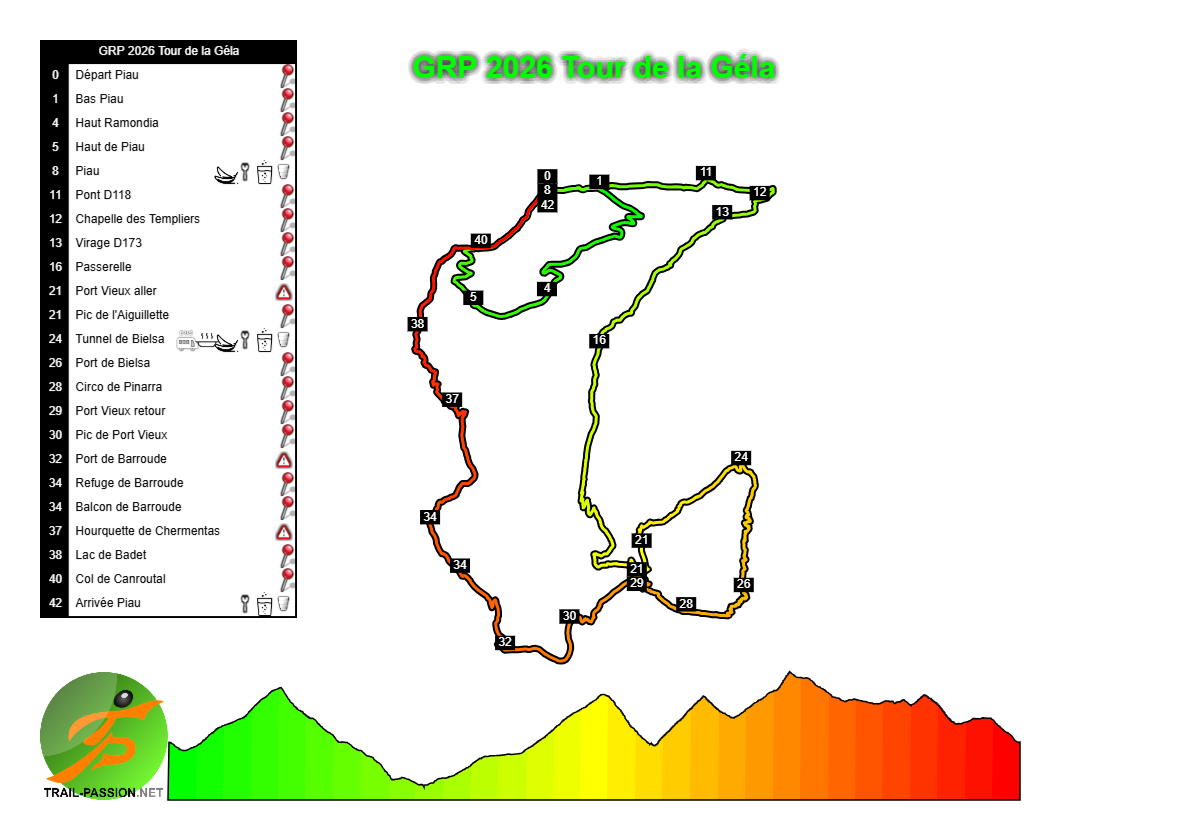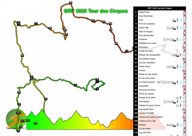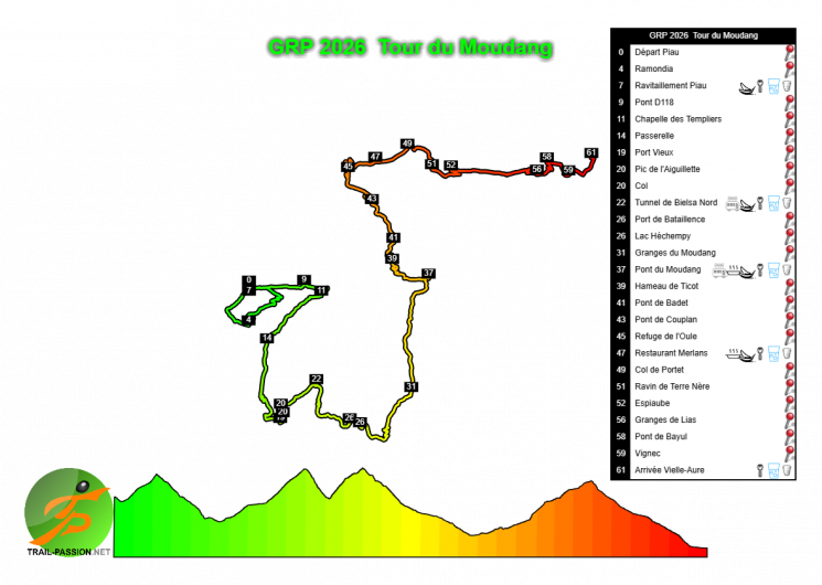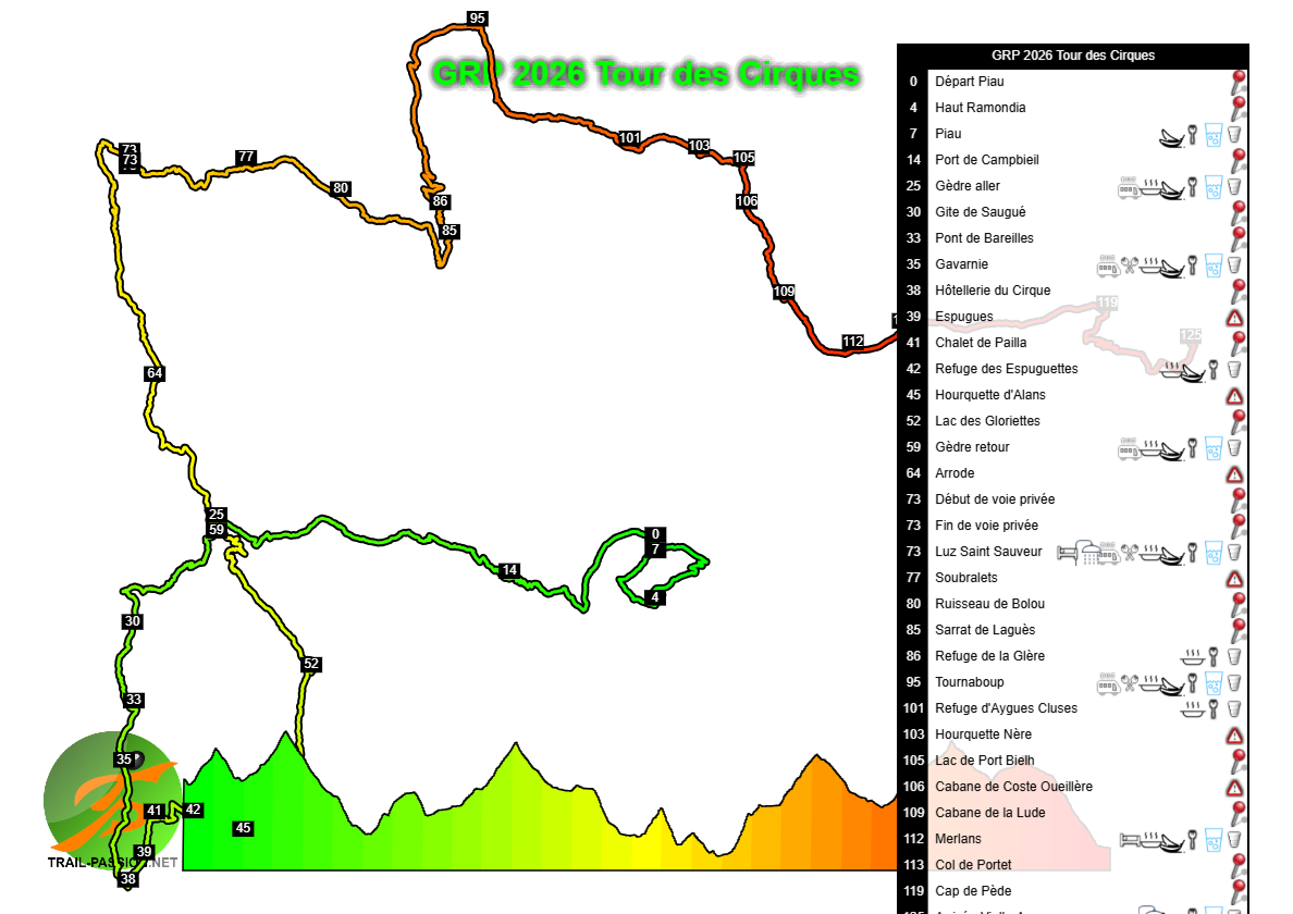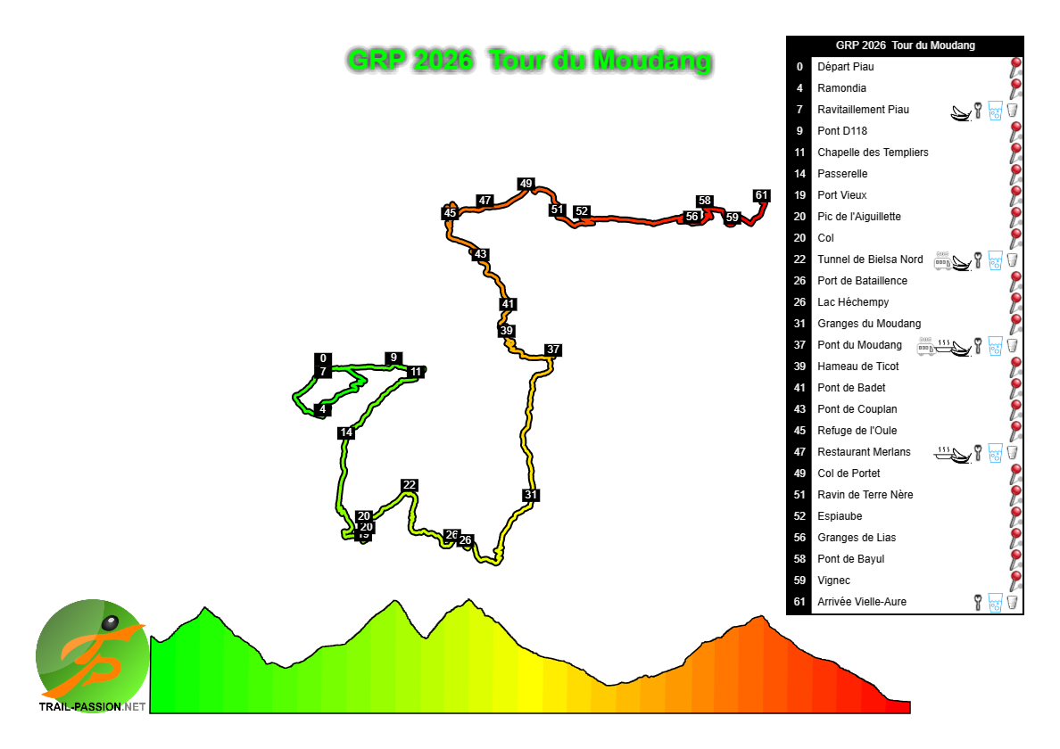 Programme : TOUTES LES COURSES depuis Vielle-Aure – https://www.grandraidpyrenees.com/fr/coursesgrp/ Ultra Tour 174km– 1000 coureurs – max 50h (départ le vendredi à 5h) – D+10400. Ultra Tour 160km en relais – 250 équipes de 4 coureurs – max 44h (départ le vendredi à 5h) – D+10400. Tour des Cirques : 120 km – 800 coureurs – max 41h (départ de Piau – le vendredi à 7h) – D+7500. Tour des Lacs : 80 km – 1 400 coureurs – max 25h (départ le samedi à 5h) – D+5100. Tour du Moudang : 60 km – 800 coureurs – max 17h (départ le jeudi à 5h30) – D+3500. Tour de la Gela : 42 km – 800 coureurs – max 12h30 (départ de Piau – le jeudi à 8h30) – D+3400. Tour du Néouvielle : 43 km – 1 400 coureurs – max 12h (départ le vendredi à 8h de Saint-Lary) – D+2400. Créé en 2025 : Tour du Bastan : 53 km – 1000 coureurs – max 16h (départ jeudi 20/08 à 7h00 au Pla d’Adet) – D+3000.