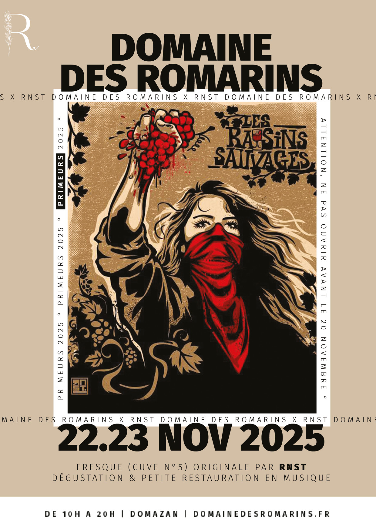 Pour la sortie de son Côtes-du-Rhône Primeur 2025, le domaine des Romarins accueille le street-artiste RNST qui inaugurera sa fresque monumentale peinte sur la cuve n°5.