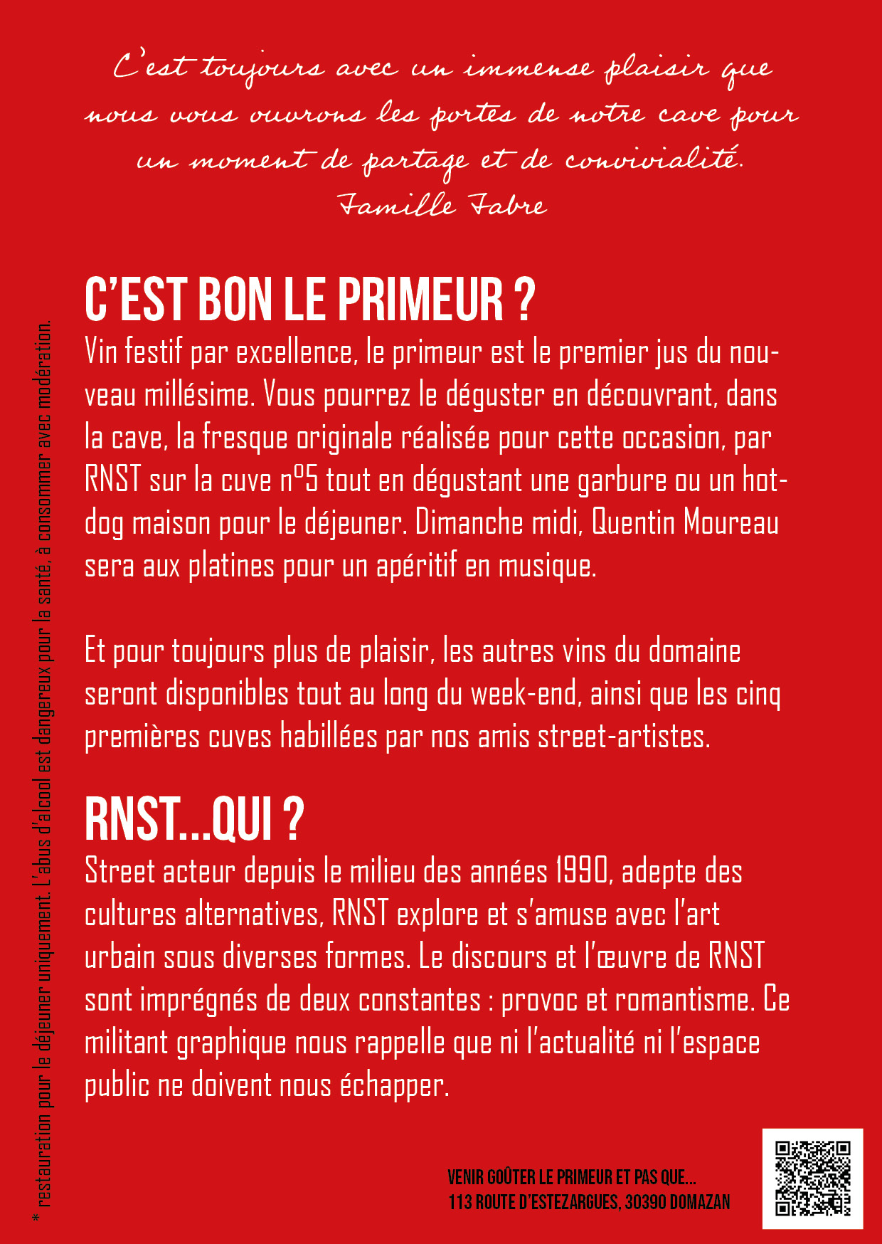 Dans une ambiance conviviale, vous pourrez venir découvrir la nouvelle fresque originale réalisée sur cuve par le street-artiste RNST, ainsi que la galerie de fresques des années précédentes. Vous pourrez déguster le vin nouveau et les autres vins du domaine tout au long du week-end et vous restaurer samedi et dimanche midi. Garbure ou hot-dog maison au menu.