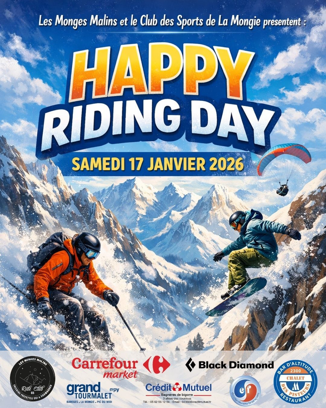 Nous avons le plaisir de vous inviter à participer au Happy Riding Day, une journée dédiée à la pratique du freeride et à la sensibilisation du risque « toute neige , tout terrain » organisée par Les Monges Malins, en partenariat avec le Club des Sports de la Mongie et la SEML du Grand Tourmalet.