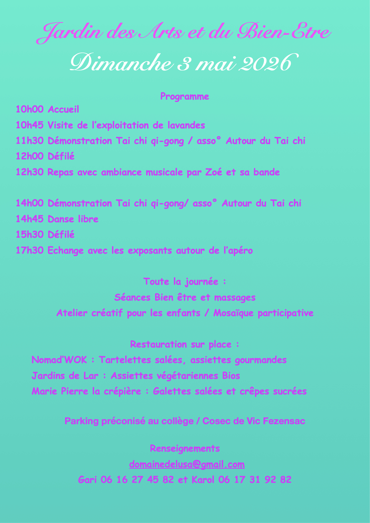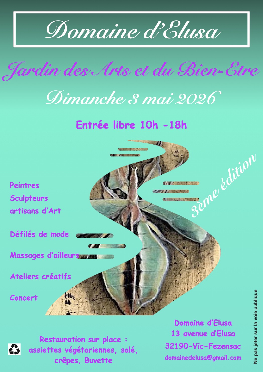 Le Jardin des Arts et du Bien-Être propose une journée d’activités variées incluant des expositions d’artistes, des défilés de mode, des massages, des ateliers créatifs et un concert. Restauration sur place disponible.