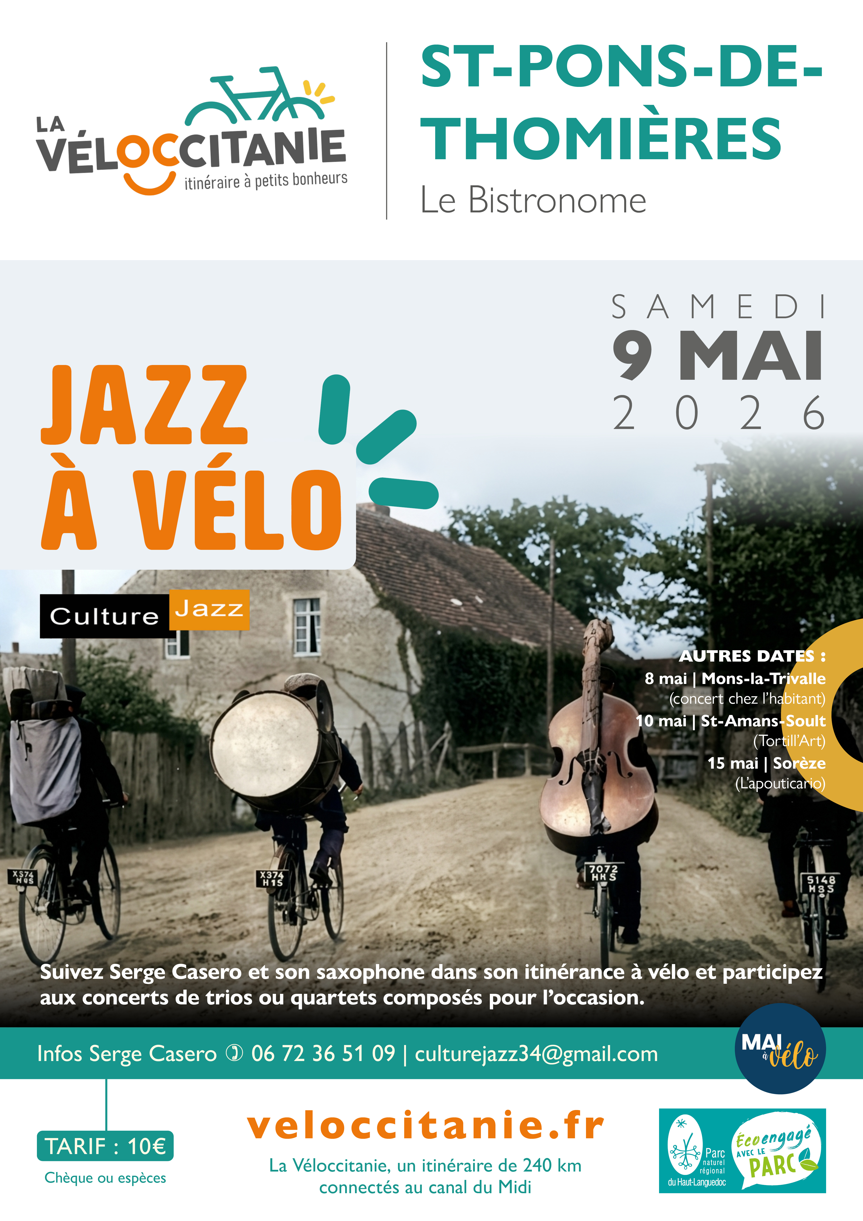 Suivez Serge Casero et son saxophone dans son itinérance à vélo le long de la Véloccitanie ! Ce projet, labellisé « Éco-engagé avec le Parc », propose de lier le partage de la route et de la musique. Pour cette date à Saint-Pons-de-Thomières, les musiciens se réunissent au Bistronome pour proposer un répertoire de jazz élaboré au fil des rencontres musicales du parcours.