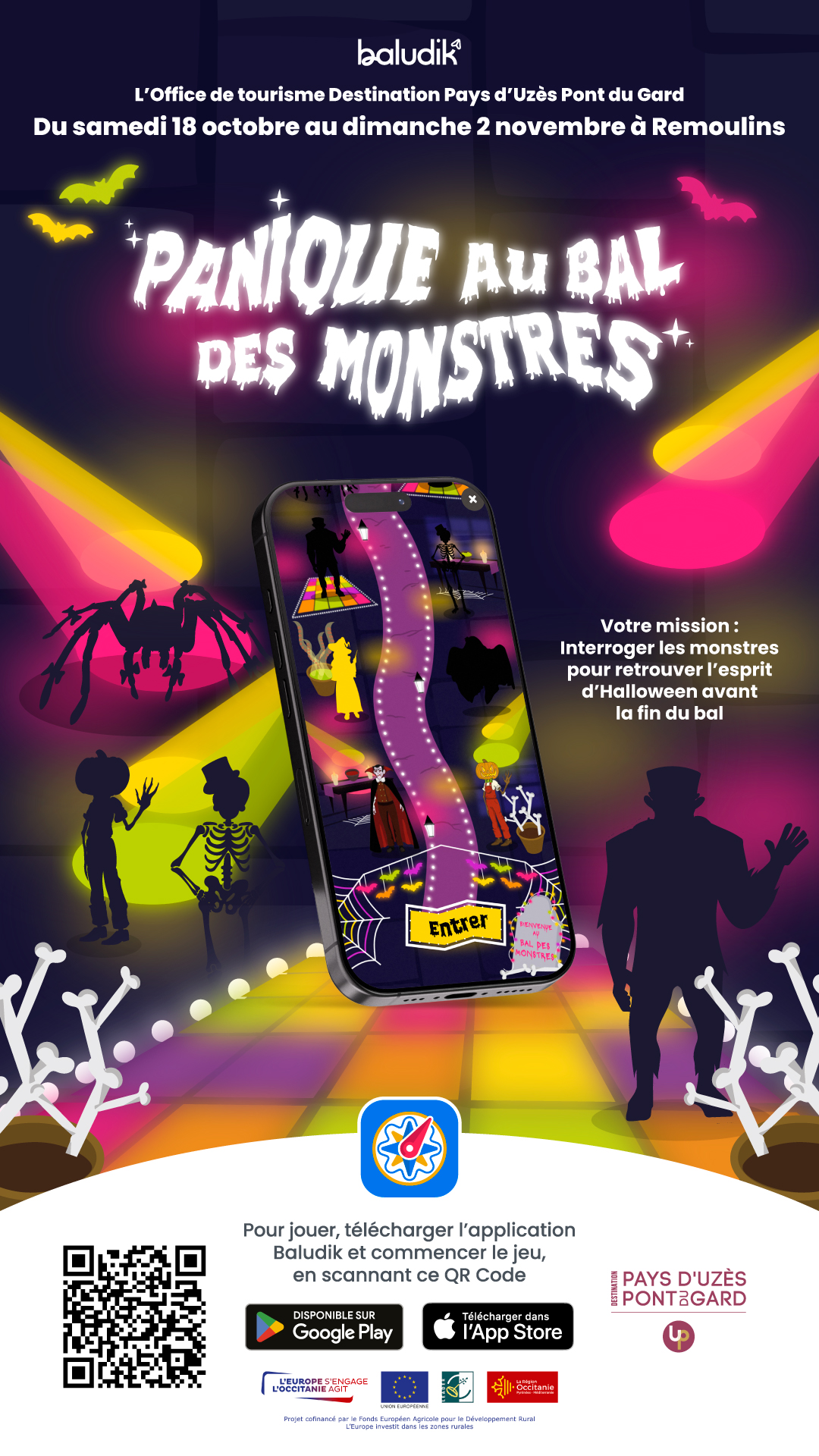 Les monstres se réunissent à Remoulins pour leur traditionnel bal. Mais, l’ambiance n’est pas au rendez-vous. Et pour cause, l’esprit d’Halloween a été dérobé ! Venez en aide aux monstres et interrogez les pour retrouver l’esprit avant la fin du bal…