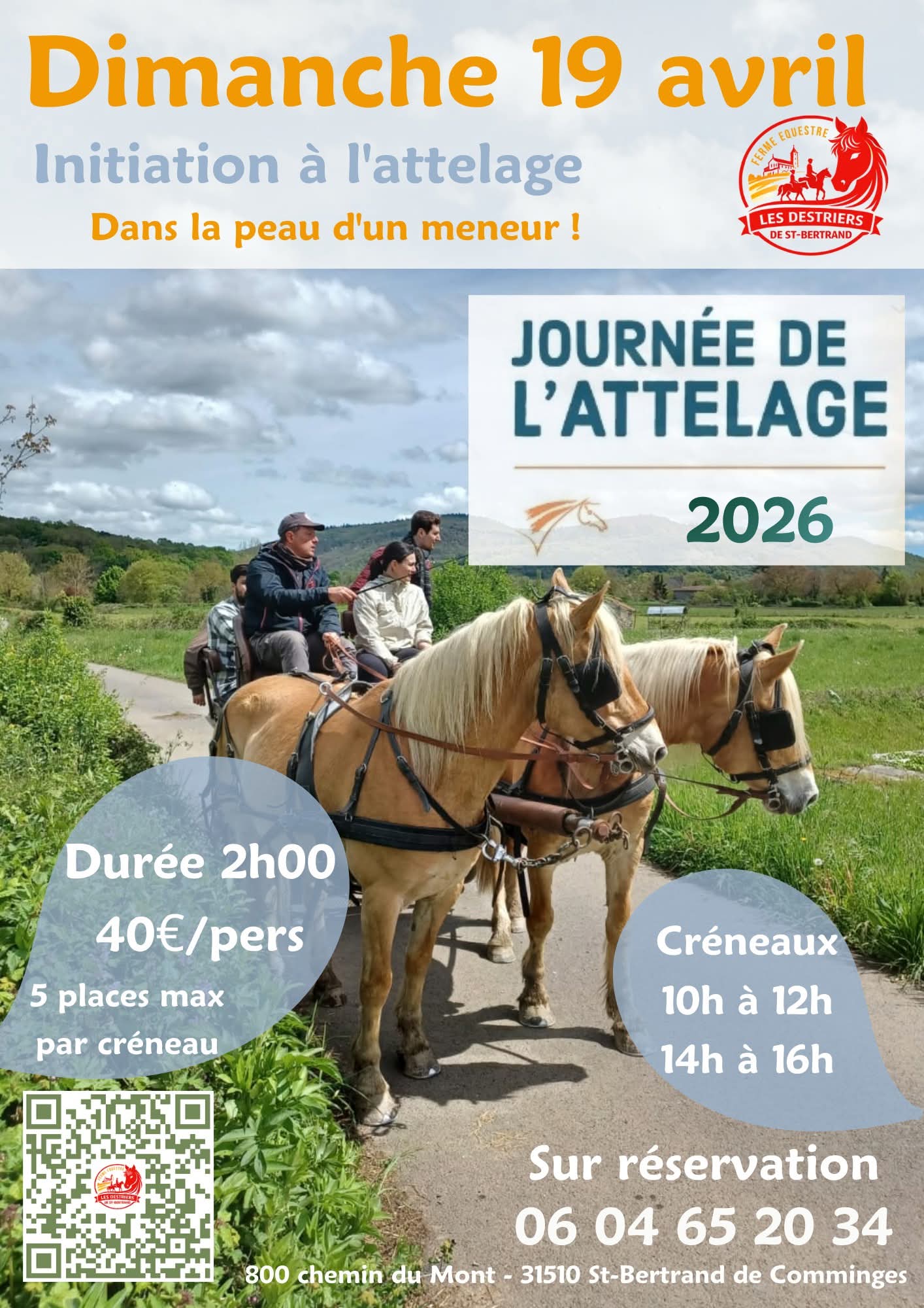 Dans le cadre des journées de l’attelage les destriers de Saint-Bertrand organisent une journée d’initiation à l’attelage. Au programme : soin aux juments, découverte du matériel et harnachement, en voiture pour une découverte de l’attelage, maniabilité et prise en main des guides.