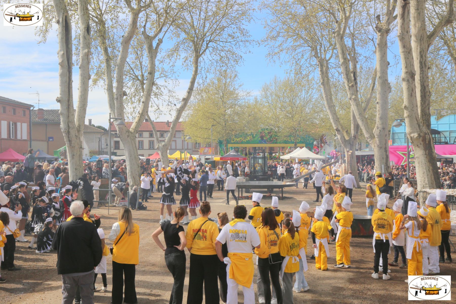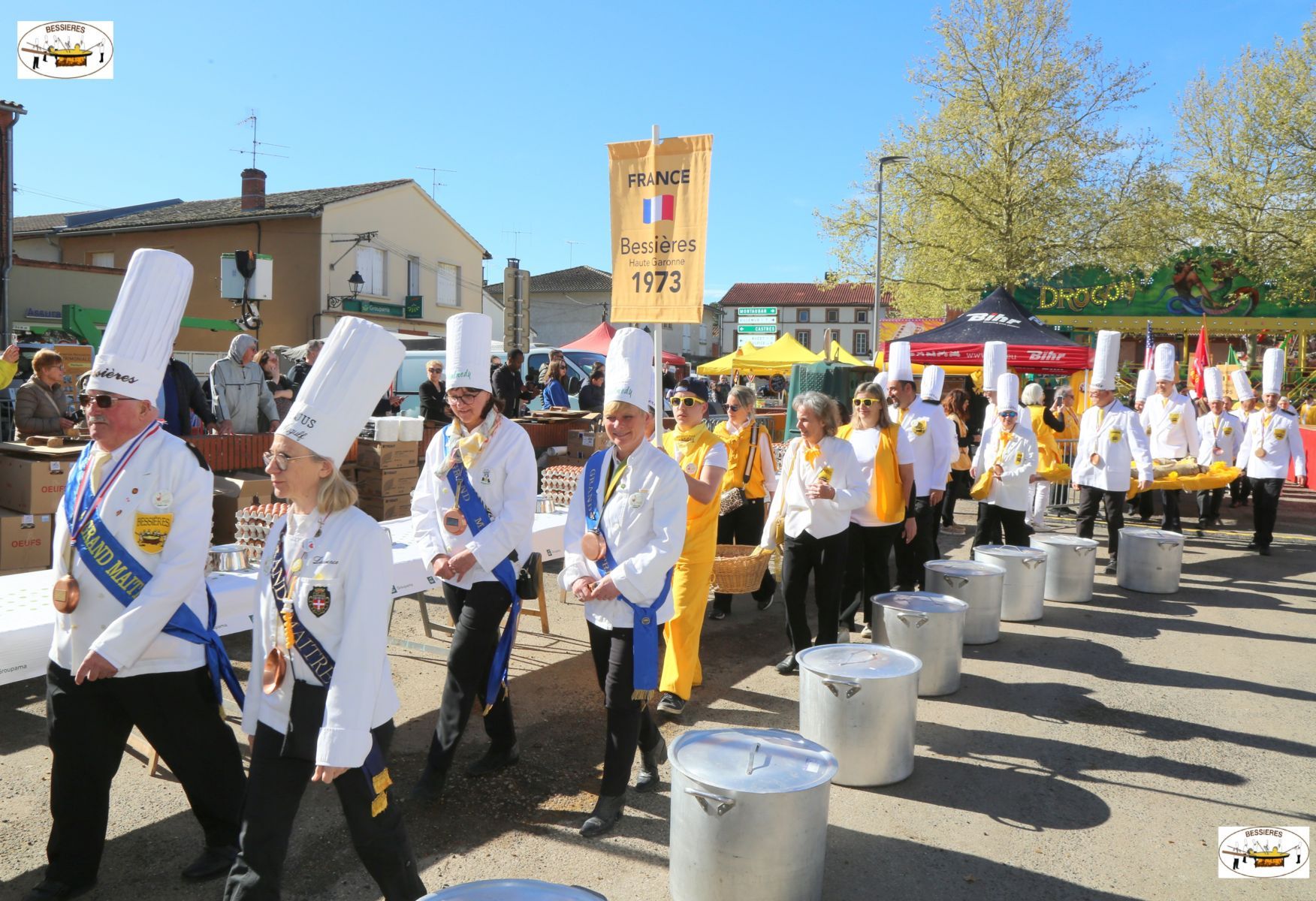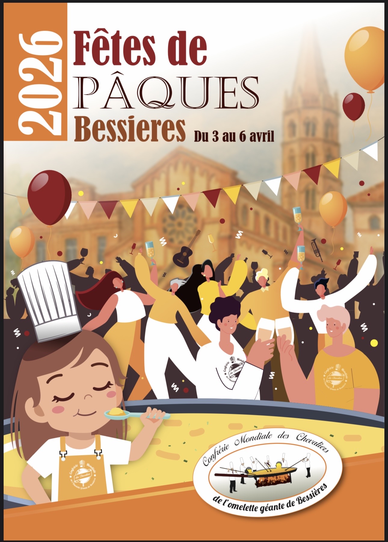Programme : Samedi 4 avril 8h30 : « Rallye touristique de voitures anciennes » , rendez-vous à l’Esplanade Bellecourt, café et collation offerts aux participants par la Confrèrie. Contact et réservation : 06 45 50 90 09 ou sur bessierespaquestour@gmail.com A partir de 19h : Soirée « Années Club Dorothée » sous le chapiteau place de la République. Animation : JAM CAT – Banda : Los Soupaeros Buvette et restauration. Traiteur : Fati FAITOUT Menu : Couscous Royal 3 viandes, dessert Makrout, vin inclus. Tarif repas : 20€ Réservation au 07 78 29 14 22 Dimanche 5 avril 10h30 : Messe de Pâques avec le pain béni offert par la Confrérie A partir de 12h : Apéritif sous le chapiteau place de la République Vers 13h : Aligot saucisse géant, dessert et vin. Tarif repas: 20€ Réservation au 07 78 29 14 22 16h : Chasse aux oeufs géante à la plaine de Balza pour les enfants de 3 à 10 ans. Inscription sur place, 1€ par enfant. A partir de 19h : Soirée « Beach Party » sous le chapiteau place de la République Animation : DJ Pro Night – Banda : La Pieuvre Buvette et restauration. Traiteur : Brasero Chez Titi Menu : Salade gasconne, entrecote et pommes de terre campagnardes, gâteau basque, vin inclus. Tarif repas : 20€ Réservation au 07 78 29 14 22 Lundi 6 avril 8h30 : Ouverture du marché de plein vent 10h30 : Défilé des Confréries Mondiales 11h : Casse de 15000 oeufs 12h : Confection de l’Omelette Géante 12h30 : Distribution GRATUITE de l’Omelette 14h : Danses Country interclubs.
