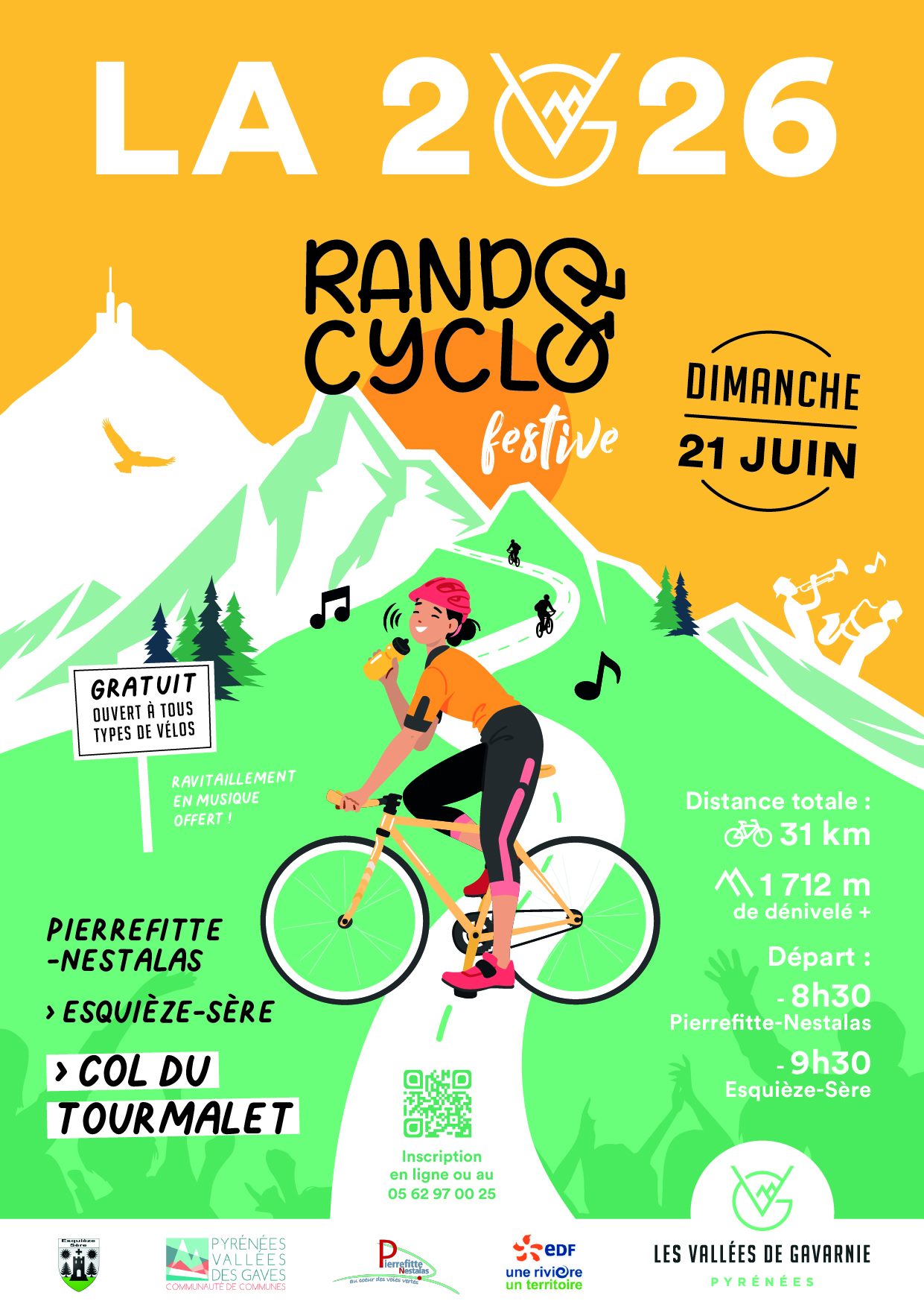 Programme : Pas de dossard, pas de chrono ! Un moment convivial et Musical Parcours total 31km. 1712 de dénivelé +. Départ musical à 8h30 de Pierrefitte Nestalas, place de la Mairie Ravitaillement en musique à Esquièze-Sère (parking du Carrefour market) et Barèges (devant l’Office de Tourisme) Possibilité de départ à 9h30 à Esquièze-Sère (parking Carrefour Market) pour 19km et 1423mD+ Arrivée au sommet du Tourmalet dès 10h15 jusqu’ à 14h… Accessible à tous types de cyclos (dont électriques). Gratuit. Inscription en ligne ou à l’Office de Tourisme d’Argelès-Gazost.