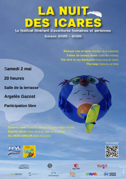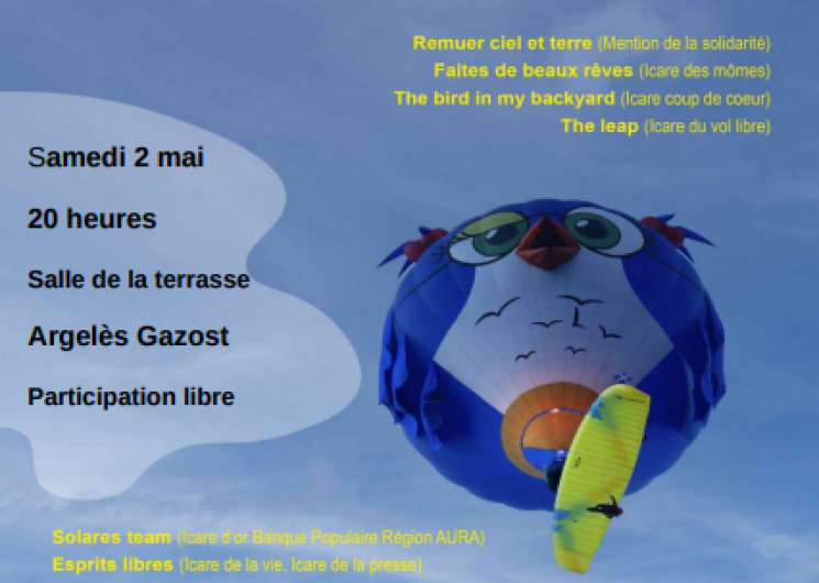 Les films présentés ont été primés lors de La Coupe Icare, (automne 2025) . La projection est organisée par le club de vol libre du pays des gaves sous le patronage de la Fédération Française de Vol Libre (FFVL).