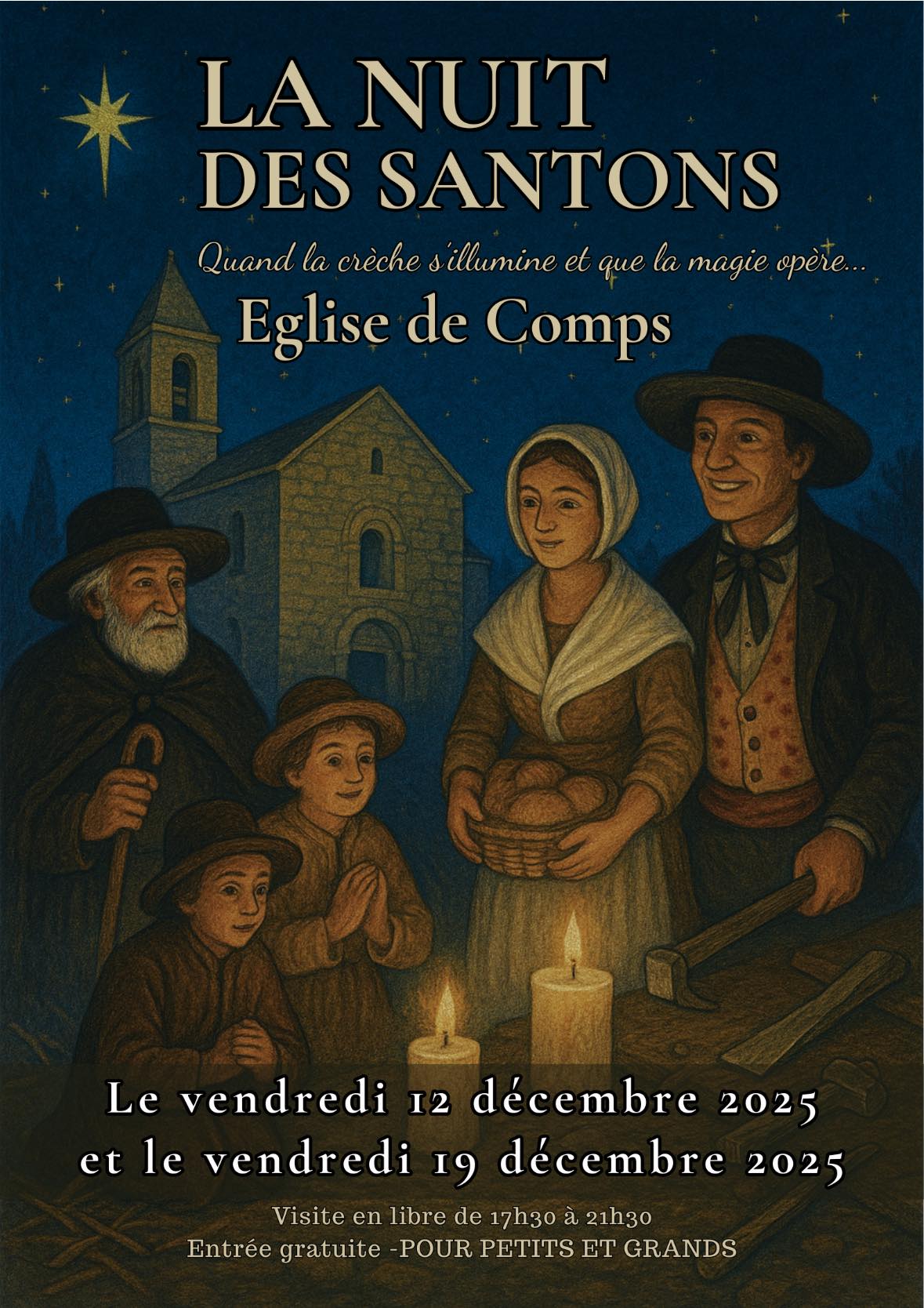 Quand la nuit tombe sur l’église de Comps, les santons prennent vie…