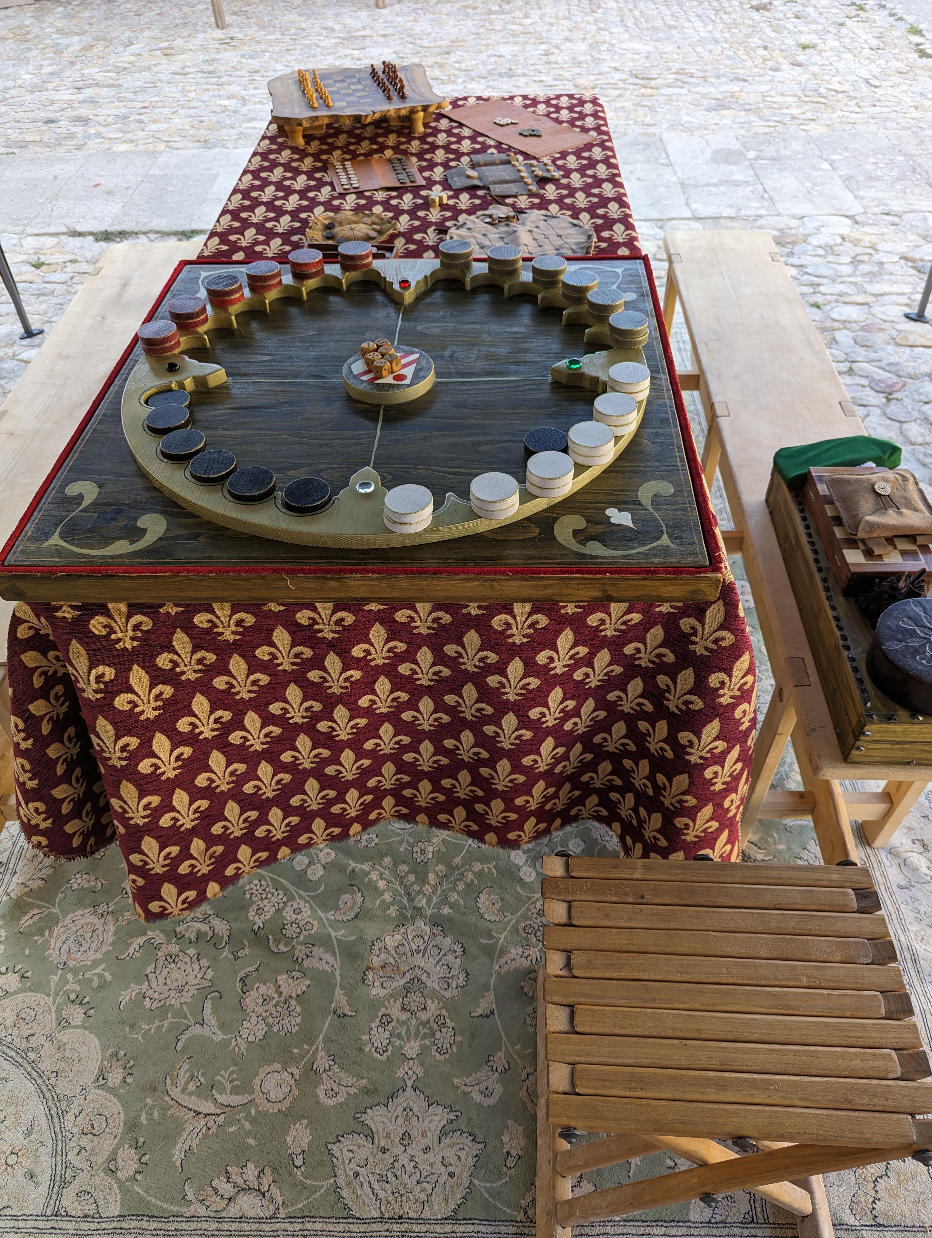 – Jeux : En toute convivialité nous faisons participer le public à divers jeux comme, El Mundo. Un jeu sorti tout droit du livre des jeux d’Alphonse X (1283), mais aussi les Dames, le Jaquet, etc…