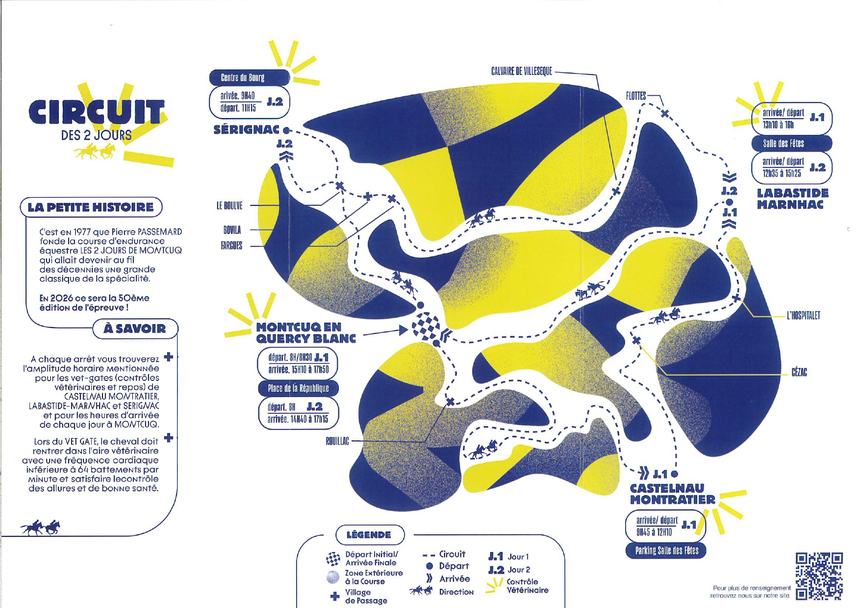 Programme : Étapes du circuit 1er jour : Montcuq/Castelnau-Montratier/Labastide-Marnhac/Montcuq – Départ : Montcuq à la Place de la République : 8h/8h30 – Étape Castelnau-Montratier : de 9h45 à 12h10 au Parking Salle des Fêtes (Foirail) – Étape Lasbastide-Marnhac : de 13h10 à 16h à la Salle des Fêtes – Arrivée : Montcuq à la Place de la République de 15h10 à 17h50 2e jour : Montcuq/Sérignac/Labastide-Marnhac/Montcuq – Départ : Montcuq au rond-point des pompiers : 8h – Étape Sérignac : de 9h40 à 11h15 dans le Centre bourg – Étape Lasbastide-Marnhac : de 12h35 à 15h25 à la Salle des Fêtes – Arrivée : Montcuq Place de la République de 14h40 à 17h15 À savoir À chaque arrêt vétérinaire, le couple cavalier/cheval doit se soumettre à un contrôle visant à vérifier que le cheval est en bonne santé (trot, rythme cardiaque, récupération, hydratation, métabolisme…). Lorsqu’il est déclaré « apte à repartir » par le vétérinaire, le couple continue l’épreuve. À tout moment, le vétérinaire peut décider d’arrêter un couple si l’intégrité physique du cheval est menacée.