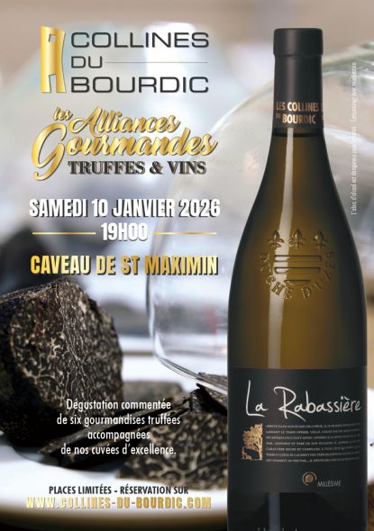 Un véritable voyage sensoriel vous est proposé par les vignerons des Collines du Bourdic : dégustation commentée de 6 gourmandises truffées, préparées par les producteurs, accompagnées par nos cuvées d’excellence.