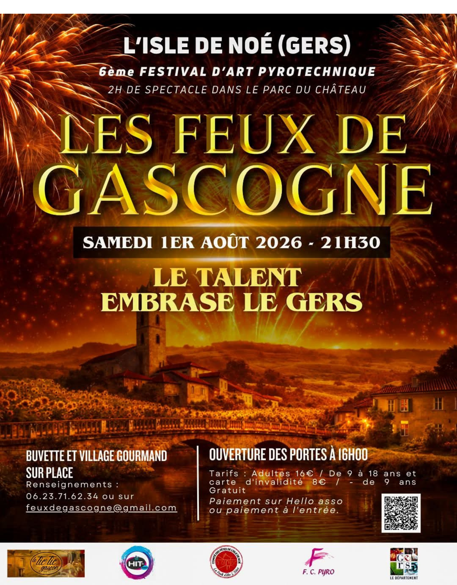 Cette année, « Le talent embrase le Gers », le Comité des fêtes de l’Isle de Noé propose un spectacle exceptionnel de 2h, fait de danse, de son, de lumières et de feux d’artifices. L’école de danse Gaëlle Curto vous enchantera par son spectacle de danse associé au feu d’artifice. Sur place vous pourrez retrouver une buvette et un village gourmand.
