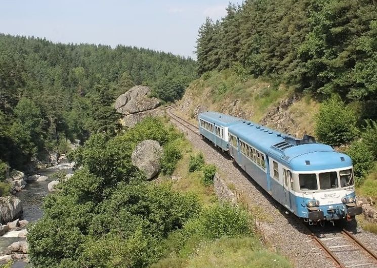 Embarquement pour une découverte des Gorges de l’Allier de gare en gare à bord du petit train bleu des voyages historiques dans le sud.