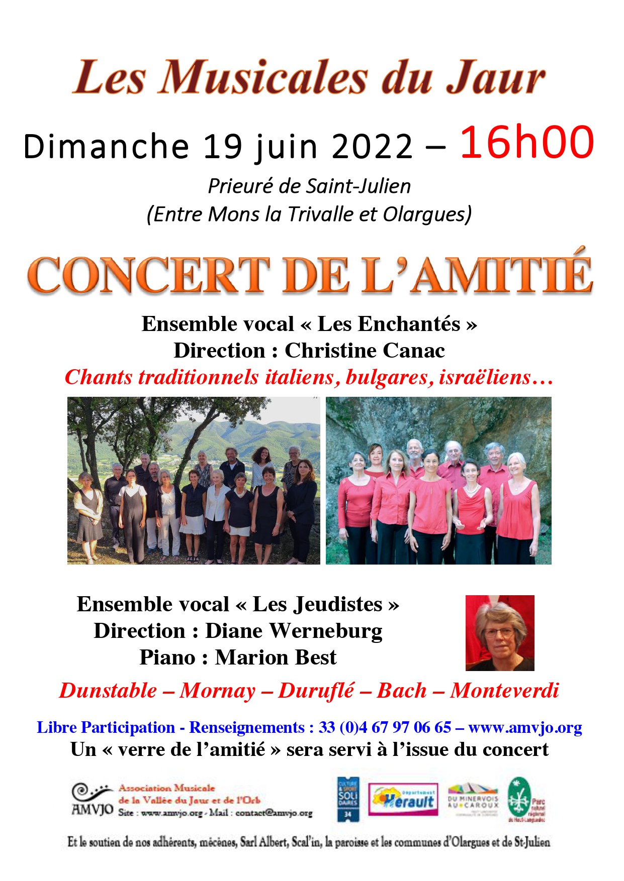 Vous aimez la musique classique ? Tout l’été, l’A. M. V. J. O. (Association Musicale de la Vallée du Jaur et de l’Orb) vous propose des concerts de qualité qui vous permettent de découvrir, dans des lieux privilégiés et dans une ambiance conviviale, aussi bien de jeunes talents à l’aube de leur carrière que des musiciens confirmés.