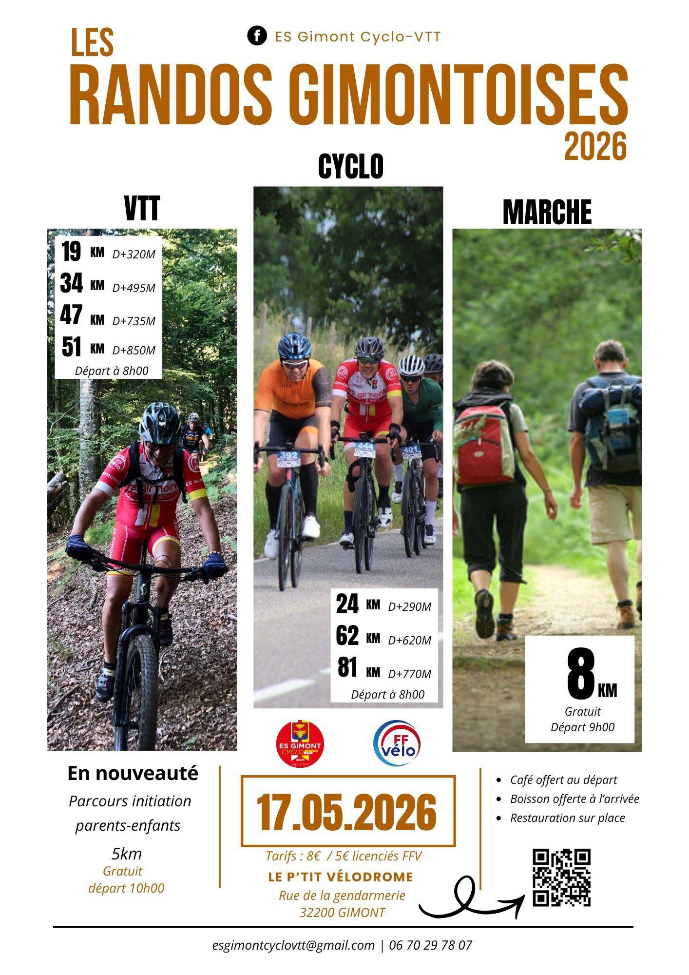 Dimanche 17 mai 2026, à partir de 8h00 au Pti Vélodrome de Gimont, sont proposés : 4 parcours VTT (dont 2 nouveautés) de 19km, 34km, 47km ou 51km, 3 circuits cyclo (24km, 62 km ou 81km) et 1 circuit marche (8km).