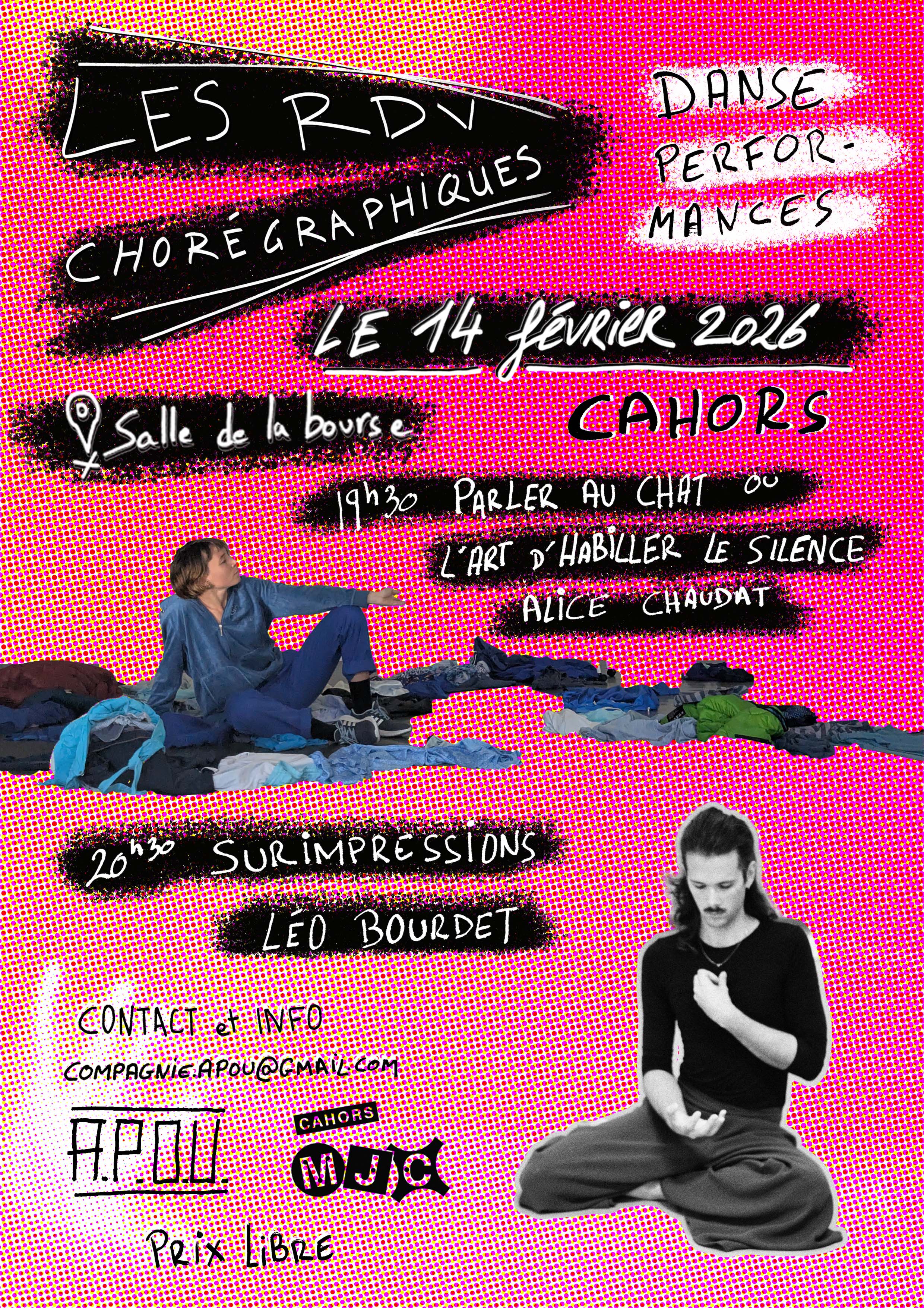 La compagnie A.P.O.U ouvre un cycle de rendez-vous chorégraphiques en partenariat avec la MJC de Cahors. »L’idée : entrer dans l’univers d’un·e danseur·euse-chorégraphe au cœur de son processus de création. » Ces rendez-vous sont l’occasion pour un·e artiste de tester un travail en cours. Il peut s’agir des prémices d’une création, d’un extrait ou de la totalité d’une pièce en cours d’élaboration. Ils permettent ainsi de se confronter à un public mixte, composé d’amateur·ice·s de danse comme de curieux·ses très éloigné de la danse. La mise en place de ce cycle est née de l’envie de mettre en lumière la création émergente en danse, ainsi que la diversité des univers, des esthétiques, des techniques et des écritures de la danse contemporaine. Sur place, il y aura de quoi boire et grignoter. Pour soutenir l’artiste, une participation à prix libre sera demandée. Ces temps mêlent processus de création, expérimentation en direct et échanges autour d’une œuvre en cours d’élaboration.