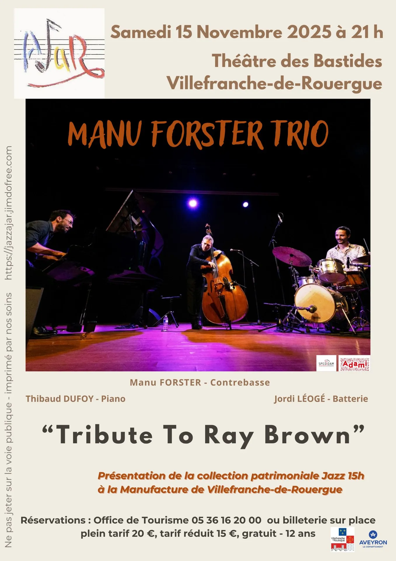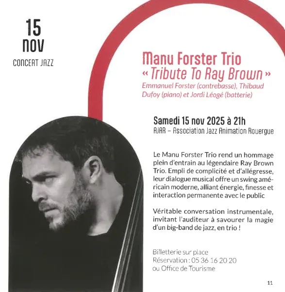 Le Manu Forster Trio rend un hommage plein d’entrain au légendaire Ray Brown Trio. Empli de complicité et d’allégresse, leur dialogue musical offre un swing américain moderne, alliant énergie, finesse et interaction permanente avec le public.