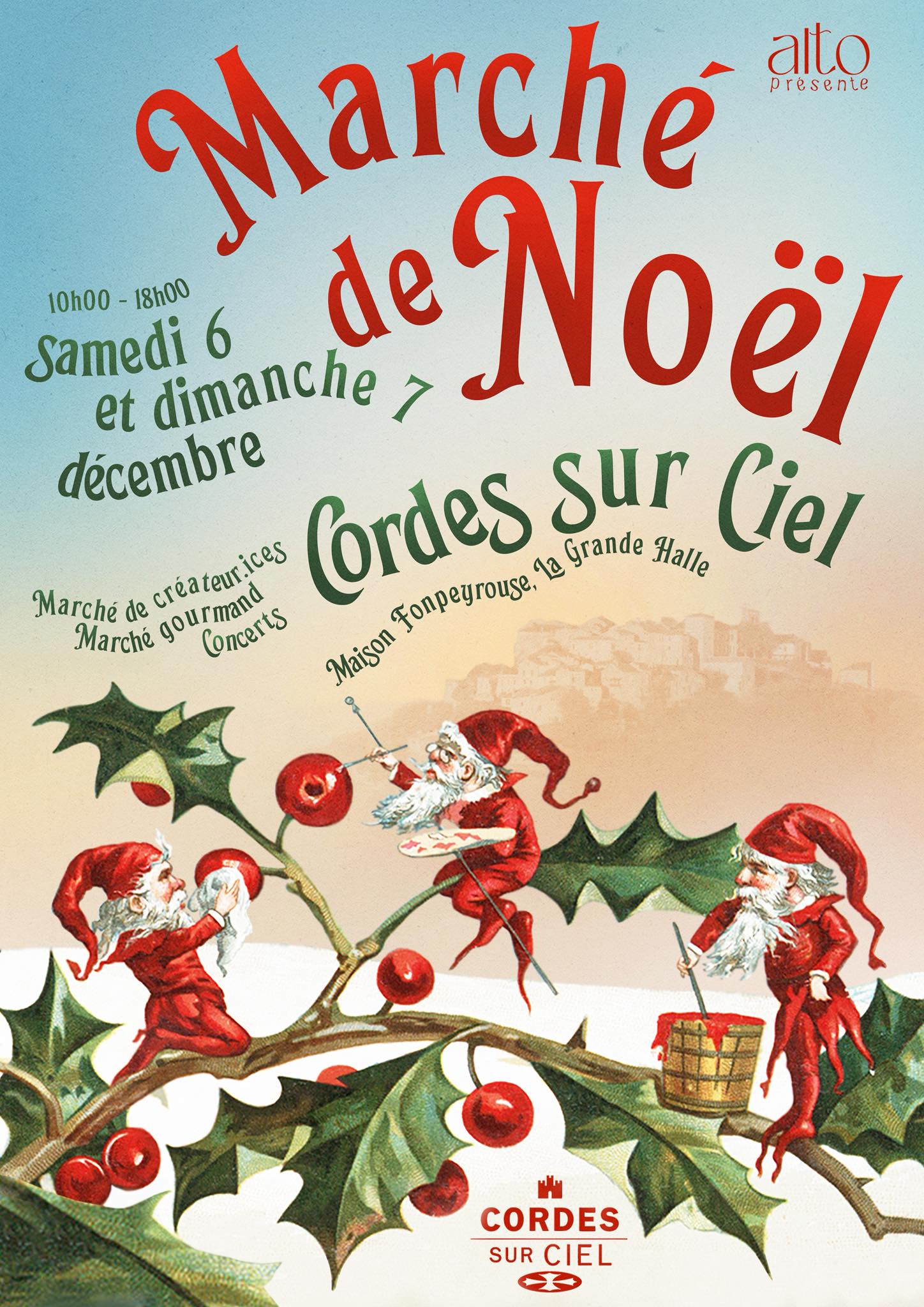 Marché de Noël artisanal et familial à Cordes-sur-Ciel : créateurs, produits gourmands, concerts et espace détente.