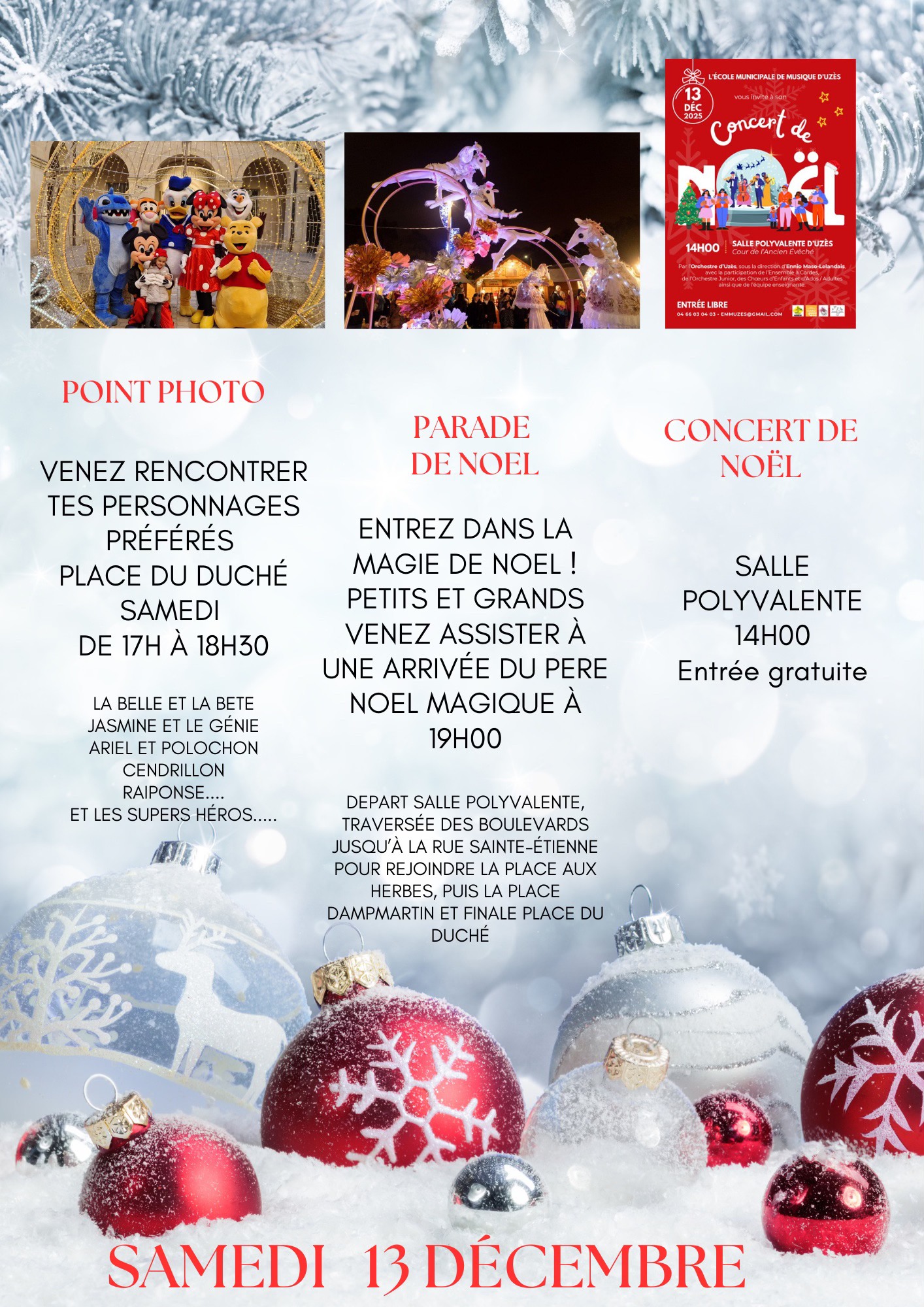 – 19h : parade féerique sur le thème des contes de Noël et arrivée du Père Noël par le Boulevard Gambetta. Animation musicale à la fin de la parade sur la Place du Duché.