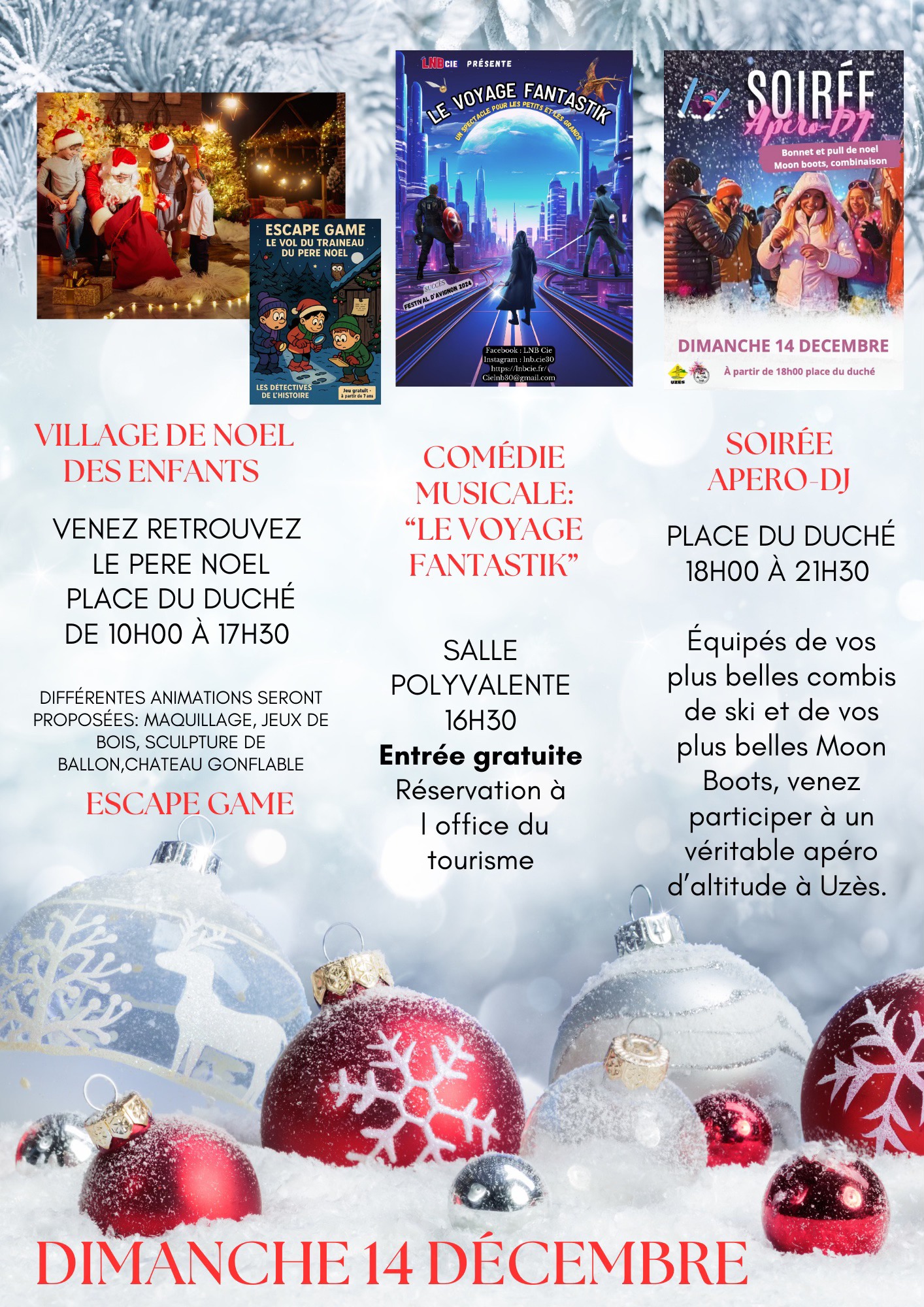 – 16h30 : comédie musicale gratuite « Le Voyage Fantastik » (offert par le Comité des Fêtes, ouverture des portes à 15h30, sur réservation auprès de l’Office de Tourisme Destination UP).