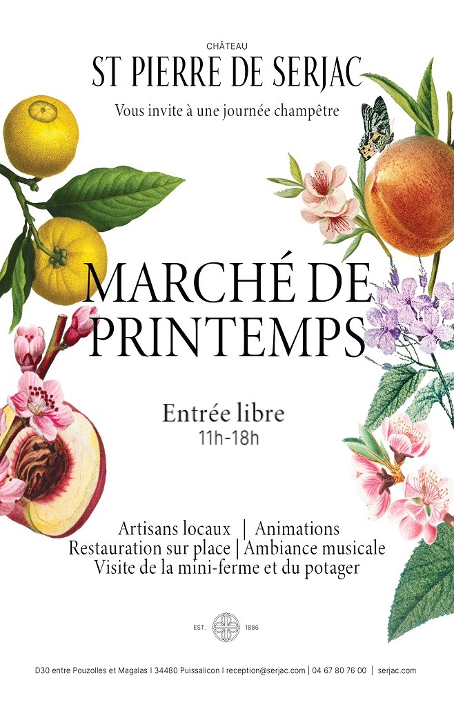Le Château St Pierre de Serjac vous donne rendez-vous, pour la 2ᵉ édition de son marché de printemps : une journée en plein air dédiée au floral et aux belles créations artisanales. Venez flâner parmi près de 50 artisans, profiter d’une ambiance festive avec DJ, jeux en bois, balade en poney, ateliers créatifs et une offre gourmande sur place (crêpes, gaufres, churros et sangria).
