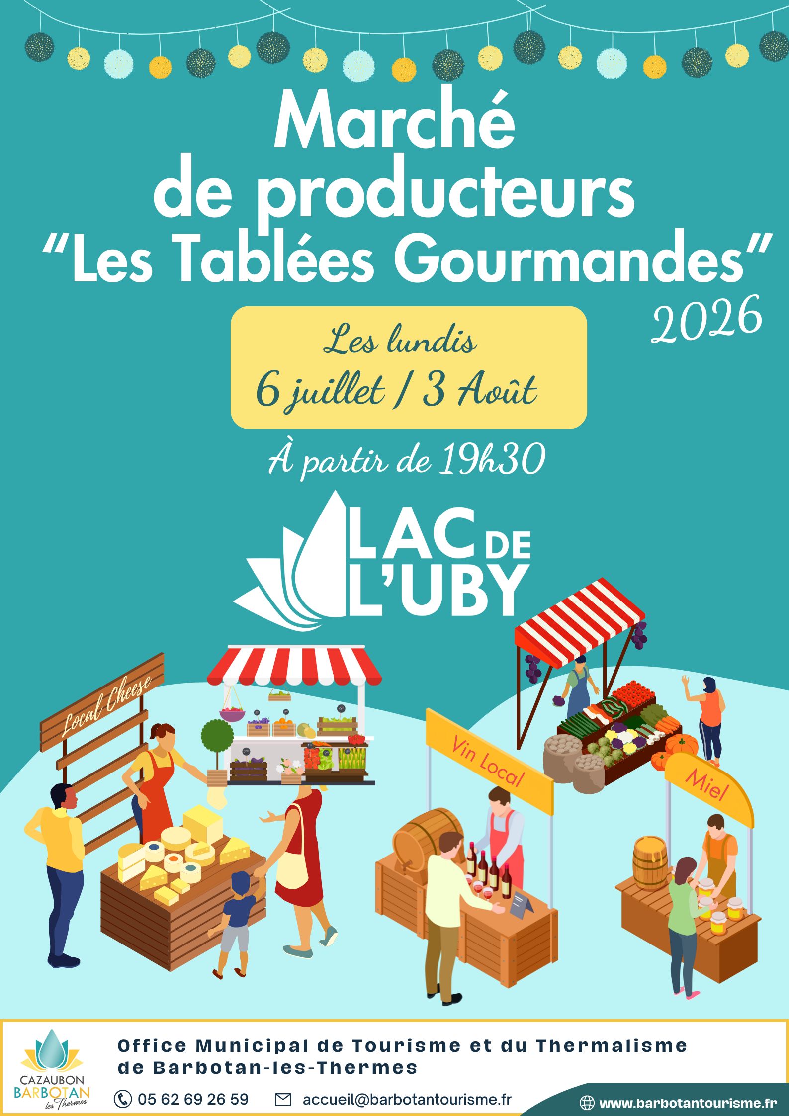 L’Office Municipal de Tourisme et du Thermalisme de Cazaubon – Barbotan-les-Thermes, avec l’appui du réseau Bienvenue à la ferme-Gers, vous propose de nouveau en 2026, 2 marchés gourmands de producteurs » Les Tablées Gourmandes », organisés sur le site du lac de l’Uby à Cazaubon !