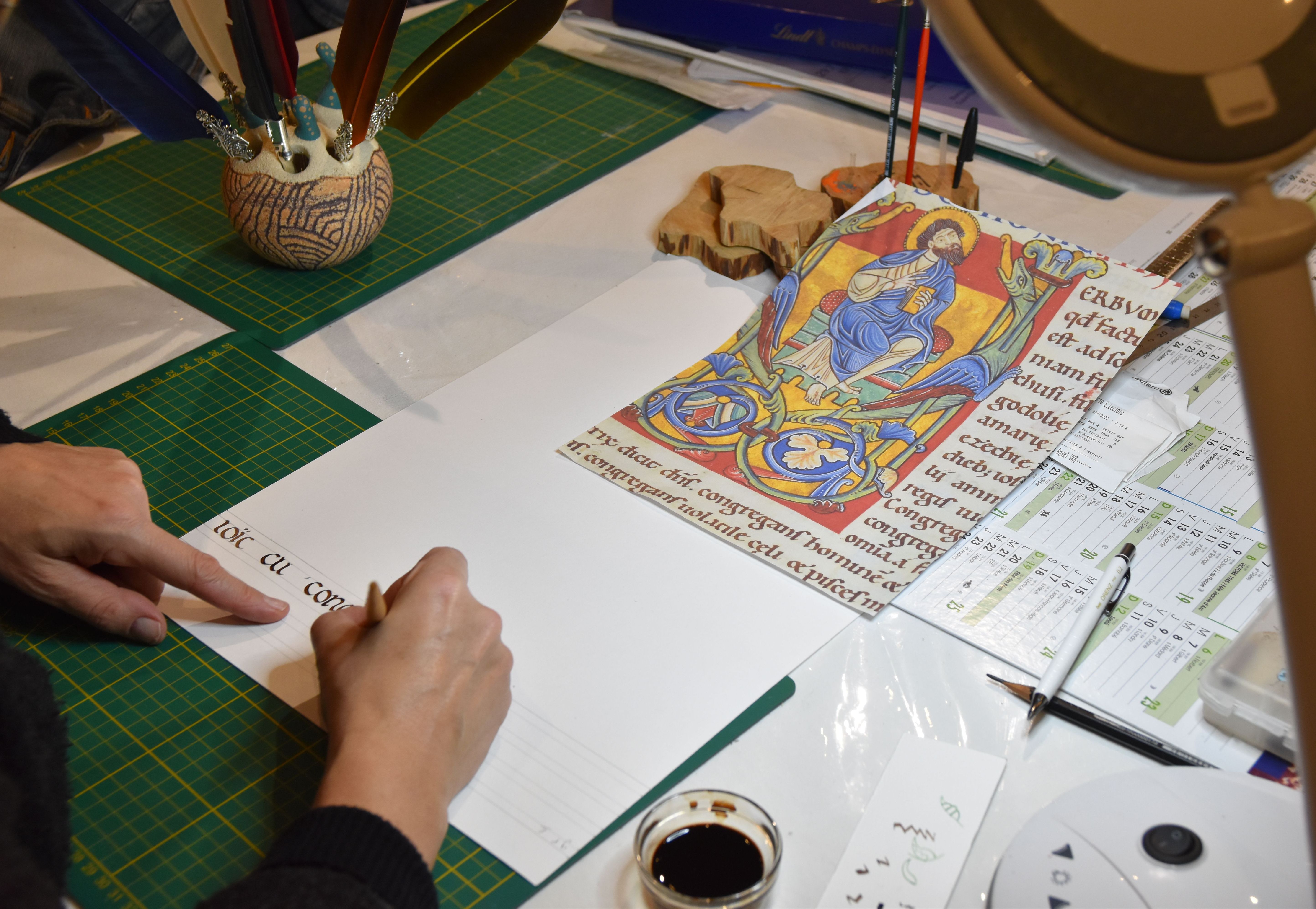 Rollie Bidas, enlumineuse professionnelle, vient présenter son travail dans le cloître.