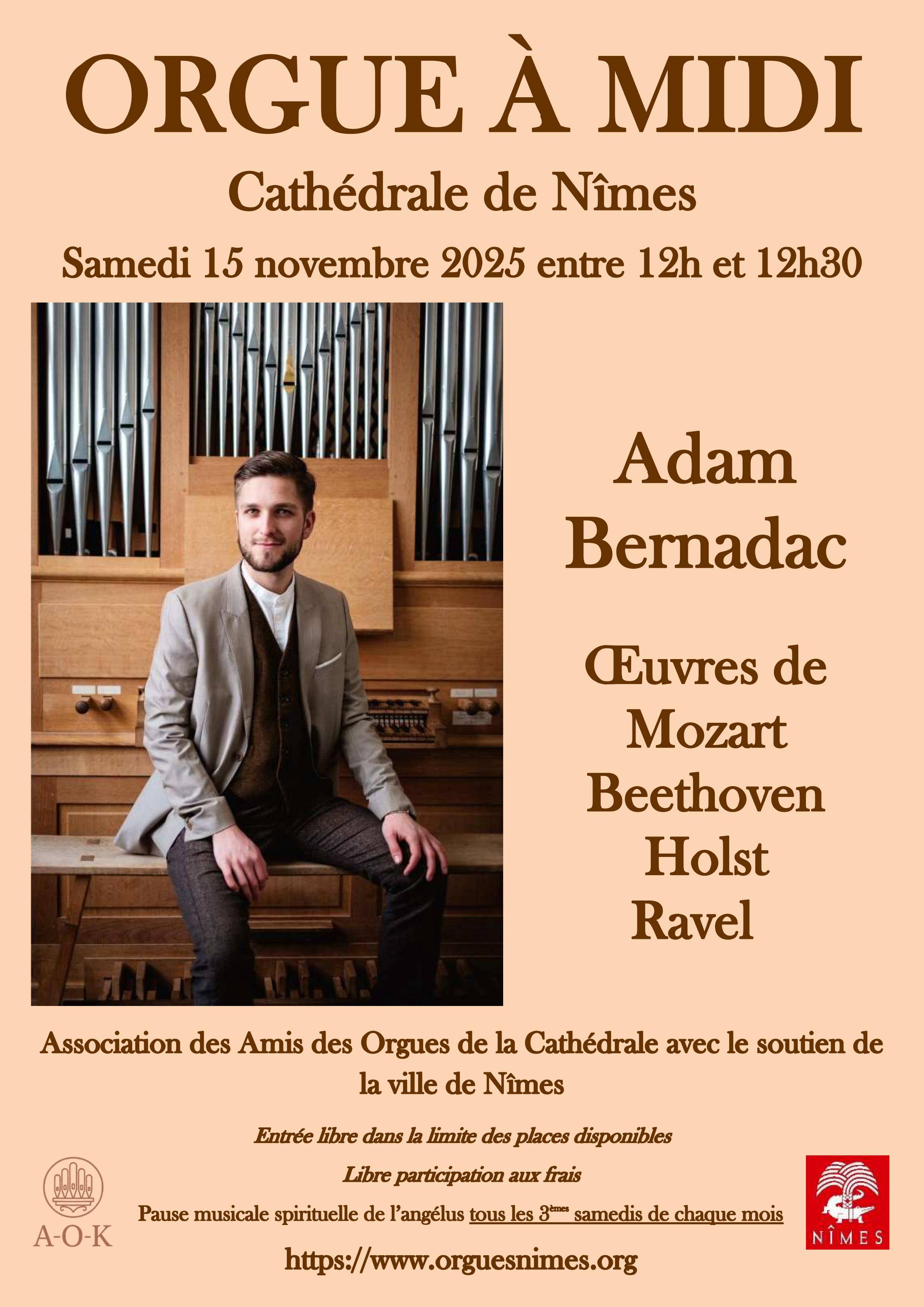 Adam Bernadac est organiste titulaire de la cathédrale de Nîmes, compositeur et également professeur d’écriture et de composition Conservatoire d’Aix-en-Provence. Il interprètera des pièces de Mozart, Beethoven Holst et Ravel.