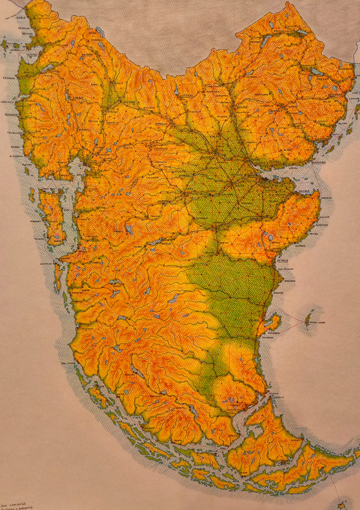 Laissant libre cours à sa fantaisie pour placer les montagnes, les plaines, les fleuves, les rivières et les lacs, les villes, les ports et les villages, les chemins de fer, les autoroutes et les routes, les aéroports et les lignes maritimes, il nous invite à voyager avec la fantaisie d’un pays idéal qui n’existe pas.