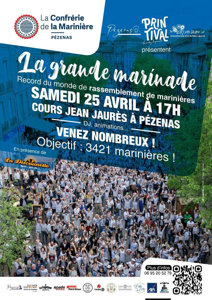 Tous en marinière le 25 avril à 17h à Pézenas ! Tentative de record du monde en hommage à Boby Lapointe, avec la Confrérie de la Marinière.
