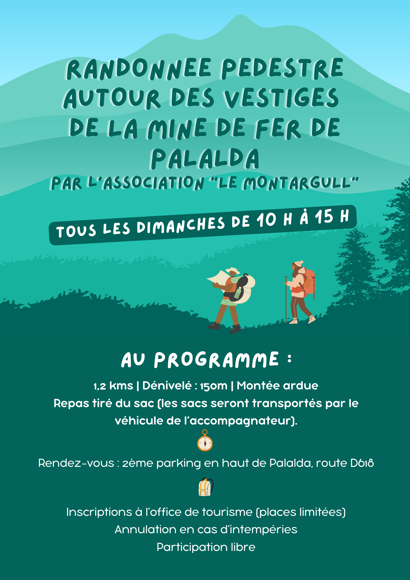 Partez à la découverte des vestiges de la mine de fer de Palalda avec l’association « Le Montargull ». Parcours de 1,2 km (150 m de dénivelé, montée ardue), repas tiré du sac.