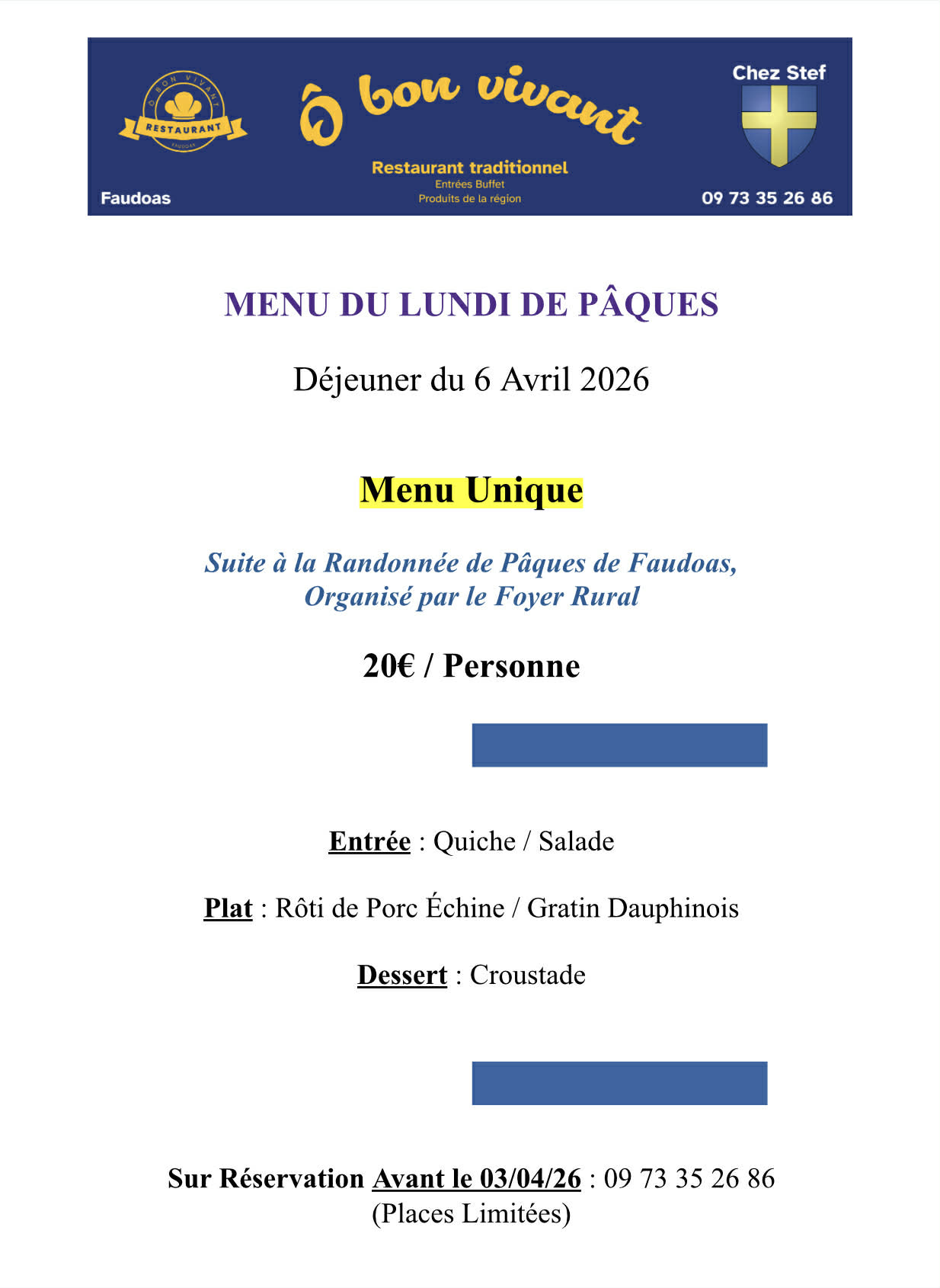 – 13h : Repas possible au restaurant O bon Vivant sur réservation au 09.73.35.26.86 (Menu unique à 20€ – voir photo)