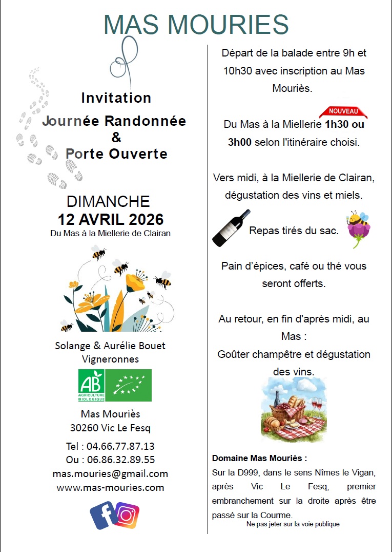 Départ du Mas Mouriès pour une balade au choix de 1h30 ou 3h jusqu’à la Miellerie de Clairan. Dégustation de vins et miels sur place, puis retour au Mas Mouriès pour un goûter champêtre et une nouvelle dégustation.