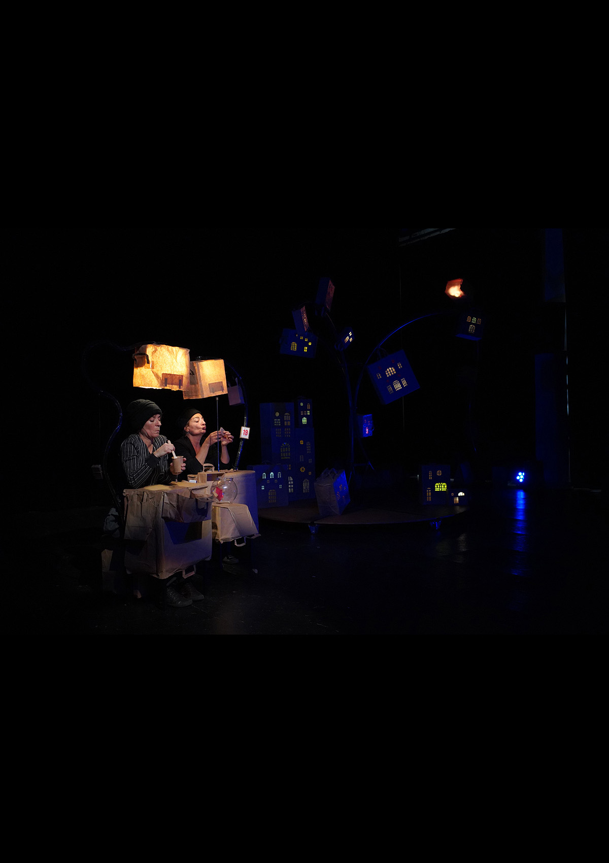 Des sacs de papiers. Des miettes cracottées. Un bubulle qui boit du thé. Un avis de bisous. Sous un arbre à maisons, ou des lumières facétieuses, deux personnages fantasques, en prise avec leurs humeurs, se frottent à leurs discordances, composent et décomposent ce petit monde à partager. Ça couine, ça froisse, ça fête. Les corps chantent, les pieds s’accrochent, les têtes s’affolent.